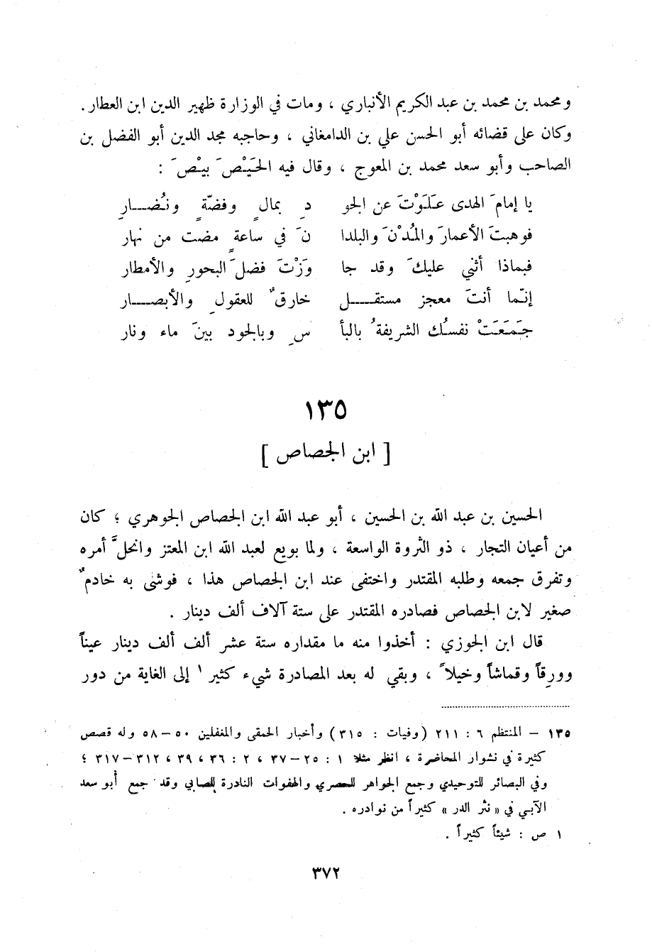 (1) المنتظم 6: 211 (وفيات: 315) وأخبار الحمقى والمغفلين 50 - 58 وله قصص كثيرة في نشوار المحاضرة، انظر مثلاً 1: 25 - 37، 2: 36، 39، 312 - 317؛ وفي البصائر للتوحيدي وجمع الجواهر للحصري والهفوات النادرة للصابي وقد جمع أبو سعد الآبي في ((نثر الدر)) كثيراً من نوادره.