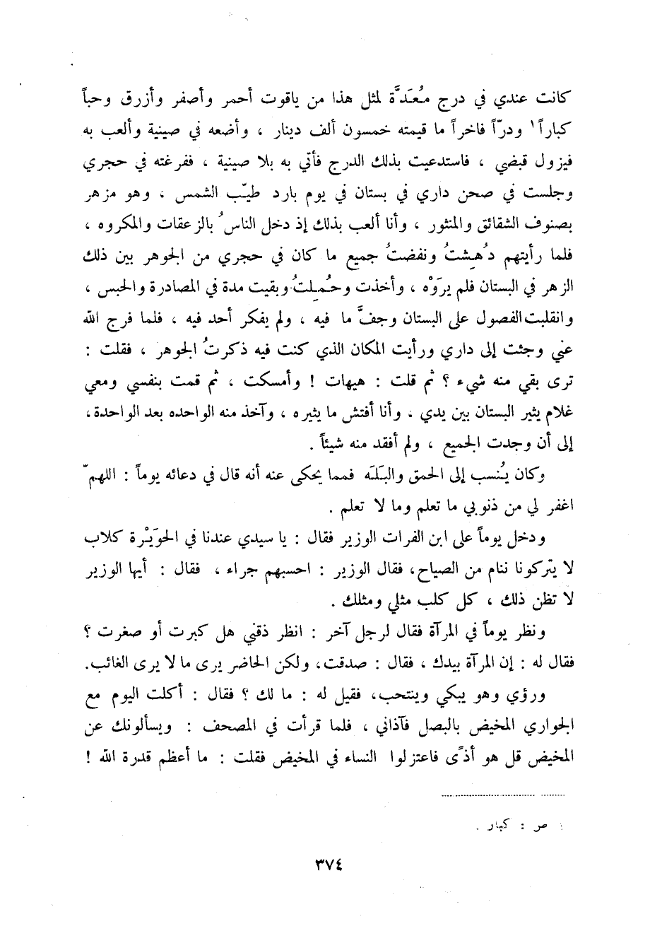 كانت عندي في درج معدة لمثل هذا من ياقوت أحمر وأصفر وأزرق وحباً كباراً (1) ودراً فاخراً ما قيمته خمسون ألف دينار، وأضعه في صينية وألعب به فيزول قبضي، فاستدعيت بذلك الدرج فأتي به بلا صينية، ففرغته في حجري وجلست في صحن داري في بستان في يوم بارد طيب الشمس، وهو مزهر بصنوف الشقائق والمنثور، وأنا ألعب بذلك إذ دخل الناس بالزعقات والمكروه، فلما رأيتهم دهشت ونفضت جميع ما كان في حجري من الجوهر بين ذلك الزهر في البستان فلم يروه، وأخذت وحملت وبقيت مدة في المصادرة والحبس، وانقلبت الفصول على البستان وجف ما فيه، ولم يفكر أحد فيه، فلما فرج الله عني وجئت إلى داري ورأيت المكان الذي كنت فيه ذكرت الجوهر، فقلت: ترى بقي منه شيء؟ ثم قلت: هيهات! وأمسكت، ثم قمت بنفسي ومعي غلام يثير البستان بين يدي، وأنا أفتش ما يثيره، وآخذ منه الواحده بعد الواحدة، إلى أن وجدت الجميع، ولم أفقد منه شيئاً.