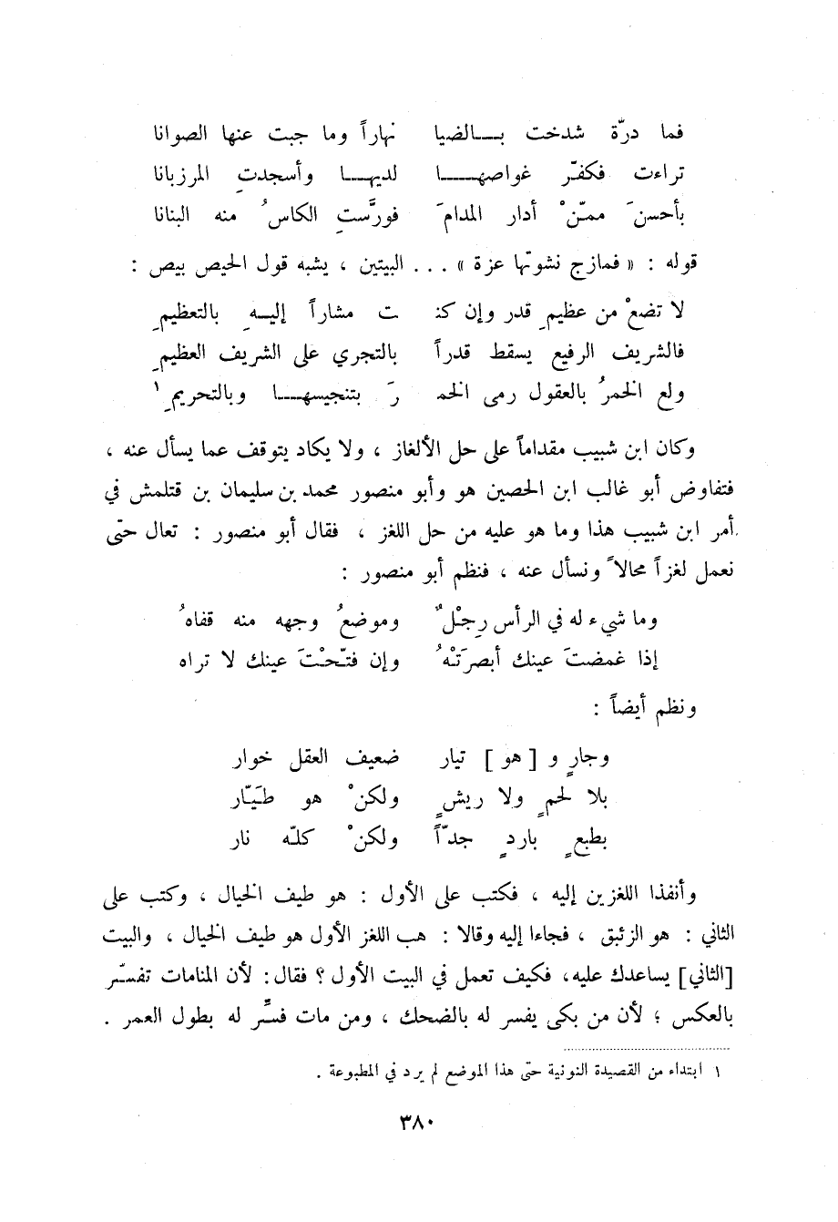 ولع الخمر بالعقول رمى الخم ... ر بتنجيسها وبالتحريم (1) وكان ابن شبيب مقداماً على حل الألغاز، ولا يكاد يتوقف عما يسأل عنه، فتفاوض أبو غالب ابن الحصين هو وأبو منصور محمد بن سليمان بن قتلمش في أمر ابن شبيب هذا وما هو عليه من حل اللغز، فقال أبو منصور: تعال حتى نعمل لغزاً محالاً ونسأل عنه، فنظم أبو منصور: