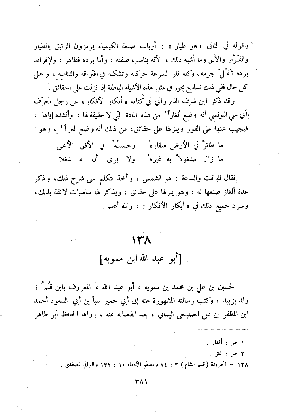وقوله في الثاني هو طيار: أرباب صنعة الكيمياء يرمزون الزئبق بالطيار والفرار والآبق وما أشبه ذلك، لأنه يناسب صفته، وأما برده فظاهر، ولإفراط برده ثقل جرمه، وكله نار لسرعة حركته وتشكله في افتراقه والتئامه، وعلى كل حال ففي ذلك تسامح يجوز في مثل هذه الأشياء الباطلة إذا نزلت على الحقائق.