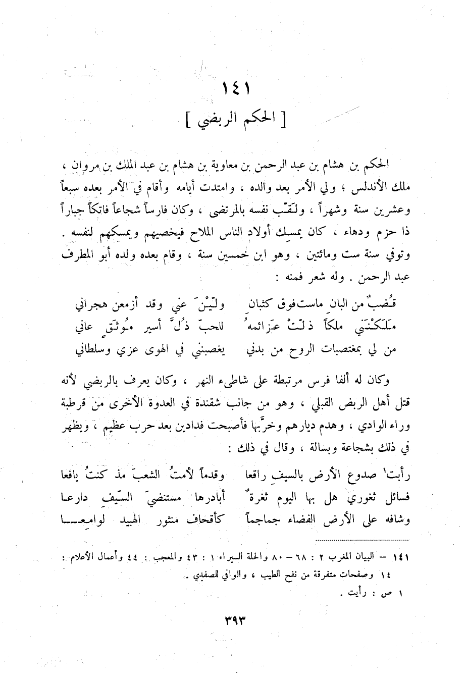 الحكم بن هشام بن عبد الرحمن بن معاوية بن هشام بن عبد الملك بن مروان، ملك الأندلس؛ ولي الأمر بعد والده، وامتدت أيامه وأقام في الأمر بعده سبعاً وعشرين سنة وشهراً، ولقب نفسه بالمرتضى، وكان فارساً شجاعاً فاتكاً جباراً ذا حزم ودهاء، كان يمسك أولاد الناس الملاح فيخصيهم ويمسكهم لنفسه. وتوفي سنة ست ومائتين، وهو ابن خمسين سنة، وقام بعده ولده أبو المطرف عبد الرحمن. وله شعر فمنه: