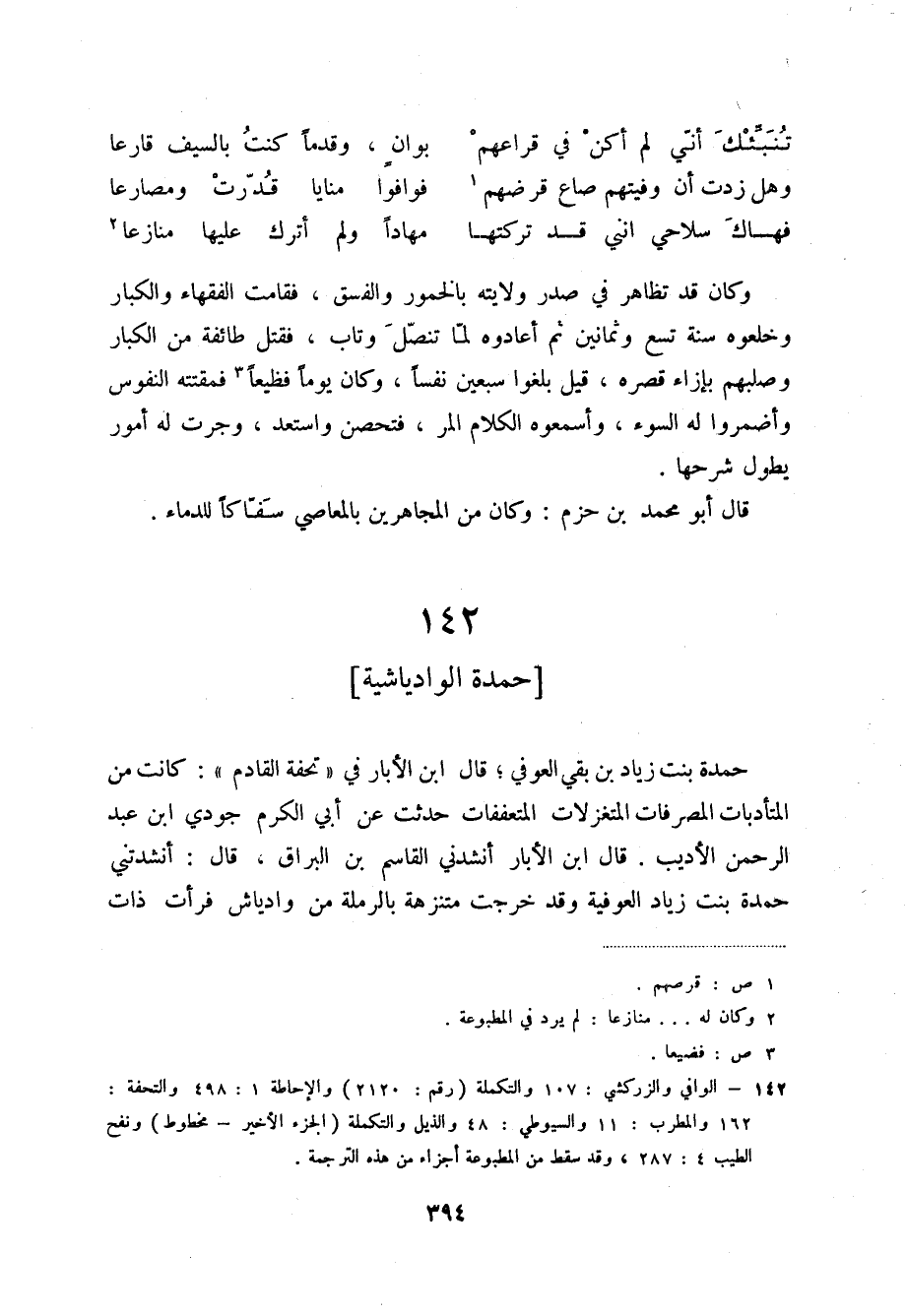 فهاك سلاحي انني قد تركتها ... مهاداً ولم أترك عليها منازعا (2) وكان قد تظاهر في صدر ولايته بالخمور والفسق، فقامت الفقهاء والكبار وخلعوه سنة تسع وثمانين ثم أعادوه لما تنصل وتاب، فقتل طائفة من الكبار وصلبهم بإزاء قصره، قيل بلغوا سبعين نفساً، وكان يوماً فظيعاً (3) فمقتته النفوس وأضمروا له السوء، وأسمعوه الكلام المر، فتحصن واستعد، وجرت له أمور يطول شرحها.