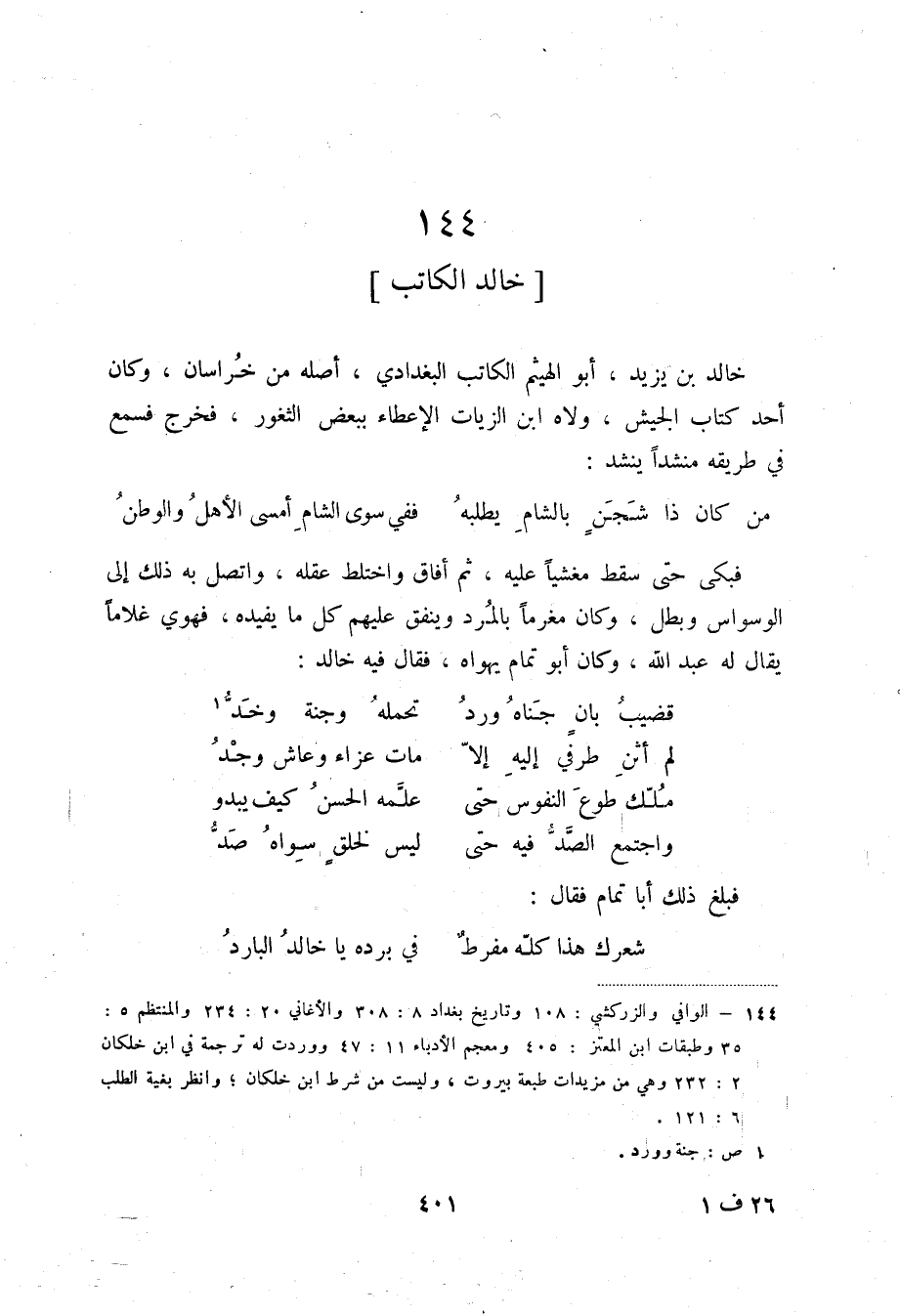 (1) الوافي والزركشي: 108 وتاريخ بغداد 8: 308 والأغاني 20: 234 والمنتظم 5: 35 وطبقات ابن المعتز: 405 ومعجم الأدباء 11: 47 ووردت له ترجمة في ابن خلكان 2: 232 وهي من مزيدات طبعة بيروت، ولبست من شرط ابن خلكان؛ وانظر بغية الطلب 6: 121.