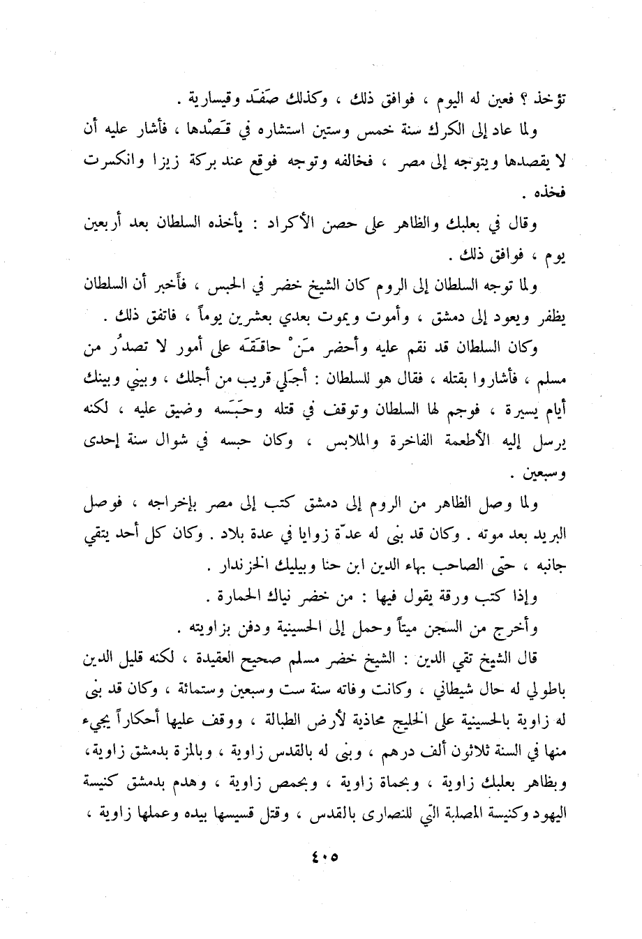 ولما وصل الظاهر من الروم إلى دمشق كتب إلى مصر بإخراجه، فوصل البريد بعد موته. وكان قد بنى له عدة زوايا في عدة بلاد. وكان كل أحد يتقي جانبه، حتى الصاحب بهاء الدين ابن حنا وبيليك الخزندار.