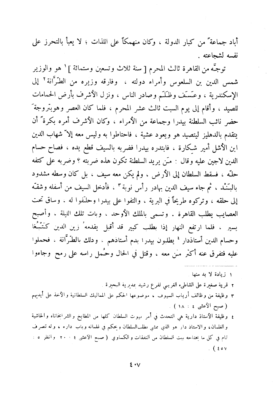 توجه من القاهرة ثالث المحرم سنة ثلاث وتسعين وستمائة (1) هو والوزير شمس الدين بن السلعوس وأمراء دولته، وفارقه وزيره من الطرانة (2) إلى الإسكندرية، وعسف وظلم وصادر الناس، ونزل الأشرف بأرض الحمامات للصيد، وأقام إلى يوم السبت ثالث عشر المحرم، فلما كان العصر وهو بتروجة حضر نائب السلطنة بيدرا وجماعة من الأمراء، وكان الأشرف أمره بكرةً أن يتقدم بالدهليز ليتصيد هو ويعود عشية، فاحتاطوا به وليس معه إلا شهاب الدين ابن الأشل أمير شكارة، فابتدره بيدرا فضربه بالسيف قطع يده، فصاح حسام الدين لاجين عليه وقال: من يريد السلطنة تكون هذه ضربته؟ وضربه على كتفه حله، فسقط السلطان إلى الأرض، ولم يكن معه سيف، بل كان وسطه مشدود بالبند، ثم جاء سيف الدين بهادر رأس نوبة (3) ، فأدخل السيف من أسفله وشقه إلى حلقه، وتركوه طريحاً في البرية، والتفوا على بيدرا وحلفوا له، وساق تحت العصايب يطلب القاهرة، وتسمى بالملك الأوحد، وبات تلك الليلة، وأصبح يسير، فلما ارتفع النهار إذا بطلب كبير قد أقبل يقدمه زين الدين كتبغا وحسام الدين أستاذدار (4) يطلبون بيدرا بدم أستاذهم، ودلك بالطرانة، فحملوا عليه فتفرق عنه أكثر من معه، وقتل في الحال وحمل راسه على رمح وجاءوا