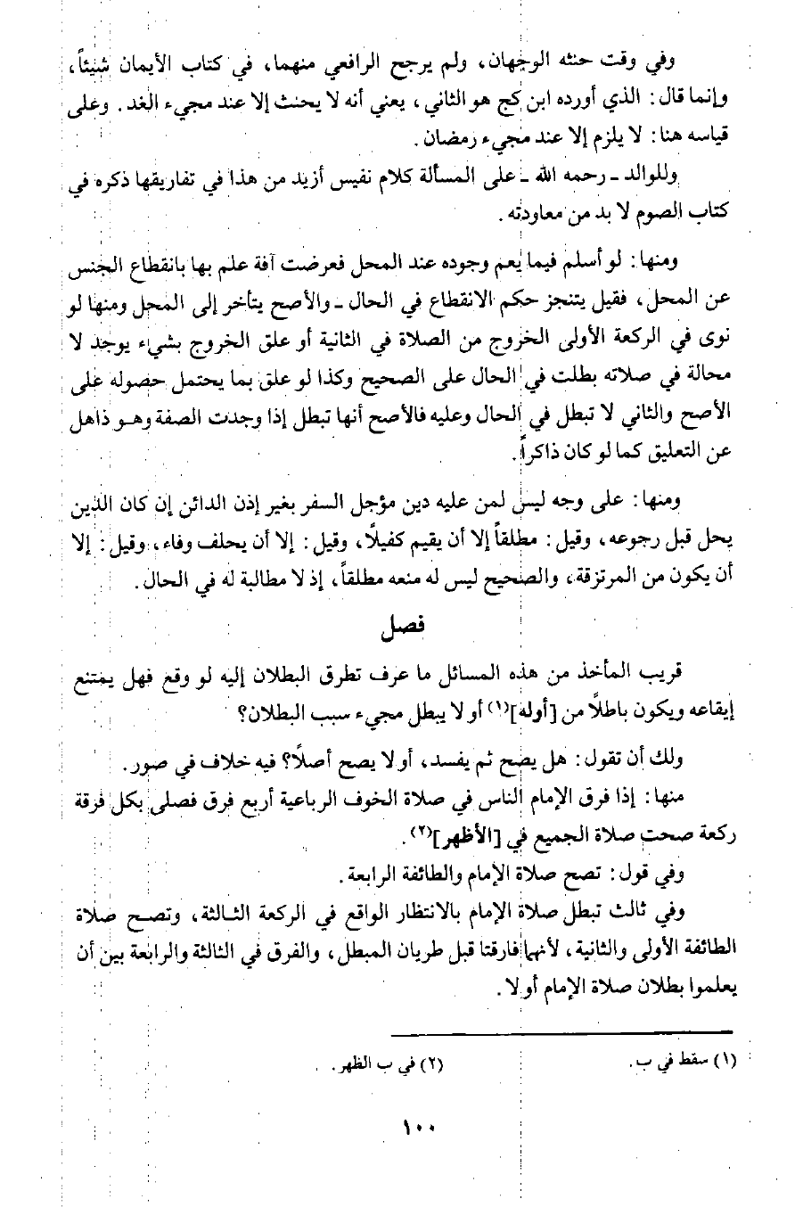 ومنها: لو أسلم فيما يعم وجوده عند المحل فعرضت آفة علم بها انقطاع الجنس عن المحل؛ فقيل ينتجز حكم الانقطاع في الحال -والأصح يتأخر إلى المحل ومنها لو نوى في الركعة الأولى الخروج من الصلاة في الثانية أو علق الخروج بشيء يوجد لا محالة في صلاته بطلت في الحال على الصحيح، وكذا لو علق بما يحتمل حصوله على الأصح والثاني لا تبطل في الحال وعليه فالأصح أنها تبطل إذا وجدت الصفة وهو ذاهل عن التعليق كما لو كان ذاكرا.