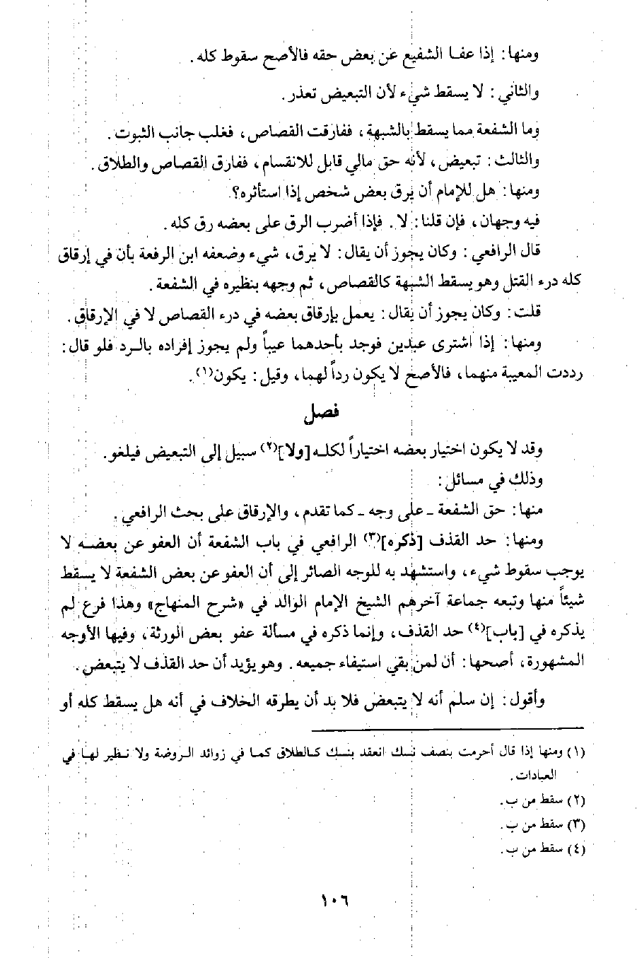 ومنها: حد القذف [ذكره] ٣ الرافعي في باب الشفعة أن العفو عن بعضه لا يوجب سقوط شيء، واستشهد به للوجه الصائر إلى أن العفو عن بعض الشفعة لا يسقط شيئا منها وتبعه جماعة آخرهم الشيخ الإمام الوالد في "شر المنهاج" وهذا فرع لم يذكره في [باب] ٤ حد القذف؛ وإنما ذكره في مسألة عفو بعض الورثة، وفيها الأوجه المشهورة، أصحها: أن لمن بقي استيفاء جميعه. وهو يؤيد أن حد القذف لا يتبعض.