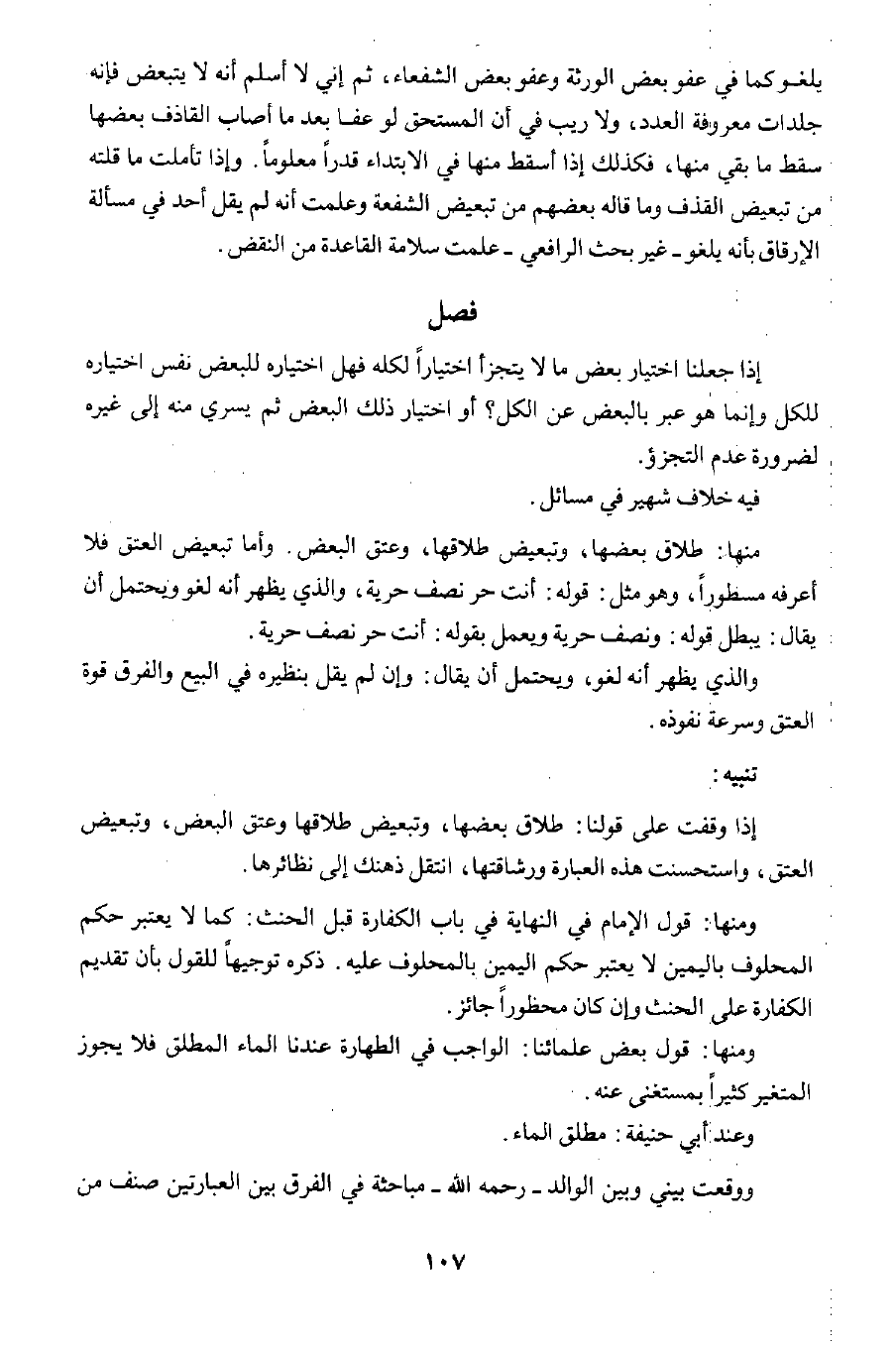 إذا وقفت على قولنا: طلاق بعضها، وتبعيض طلاقها وعتق البعضِ، وتبعيض العتق، واستحسنت هذه العبارة ورشاقتها، انتقل ذهنك إلى نظائرها.
