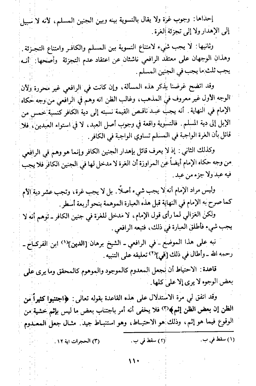 وقد اتضح غرضنا بذكر هذه المسألة، وإن كانت في الرافعي غير محررة، ولأن الوجه الأول غير معروف في المذهب، وغالب الظن أنه وهم في الرافعي من وجه حكاه الإمام في النهاية. أنه يجب عبد ناقص القيمة نسبته غلى دية الكافر كنسبة خمس من الإبل إلى دية المسلم؛ فالتسوية واقعة في وجوب أصل العبد، لا في استواء العبدين؛ فلا قائل بأن الغرة الواجبة في المسلم تساوي الواجبة في الكافر.