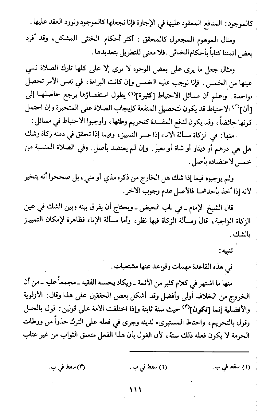 منها ما اشتهر في كلام كثير من الأئمة -ويكاد يحسبه الفقيه -مجمعها عليه- من أن الخروج من الخلاف أولى وأفضل وقد أشكل بعض المحققين على هذا وقال: الأولوية والأفضلية إنما [يكون] ٣ حيث سنة ثابتة وإذا اختلفت الأمة على قولين: قول بالحل وقول بالتحريم، واحتاط المستبريء لدينه وجرى في فعله على الترك حذرا من ورطات الحرمة لا يكون فعله ذلك سنة؛ لأن القول بأن هذا الفعل متعلق الثواب من غير عتاب