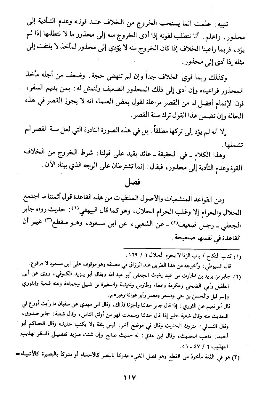 وكذلك ربما قوي الخلاف جدا وإن لم تنهض حجة. وضعف من أجله مأخذ المحذور فراعيناه وإن أدى إلى ذلك المحذور الضعيف ولنمثل له: بمن يديم السفر؛ فإن الإتمام أفضل له من القصر مراعاة لقول بعض العلماء أنه لا يجوز القصر في هذه الحالة وإن تضمن هذا القول ترك سنة القصر.