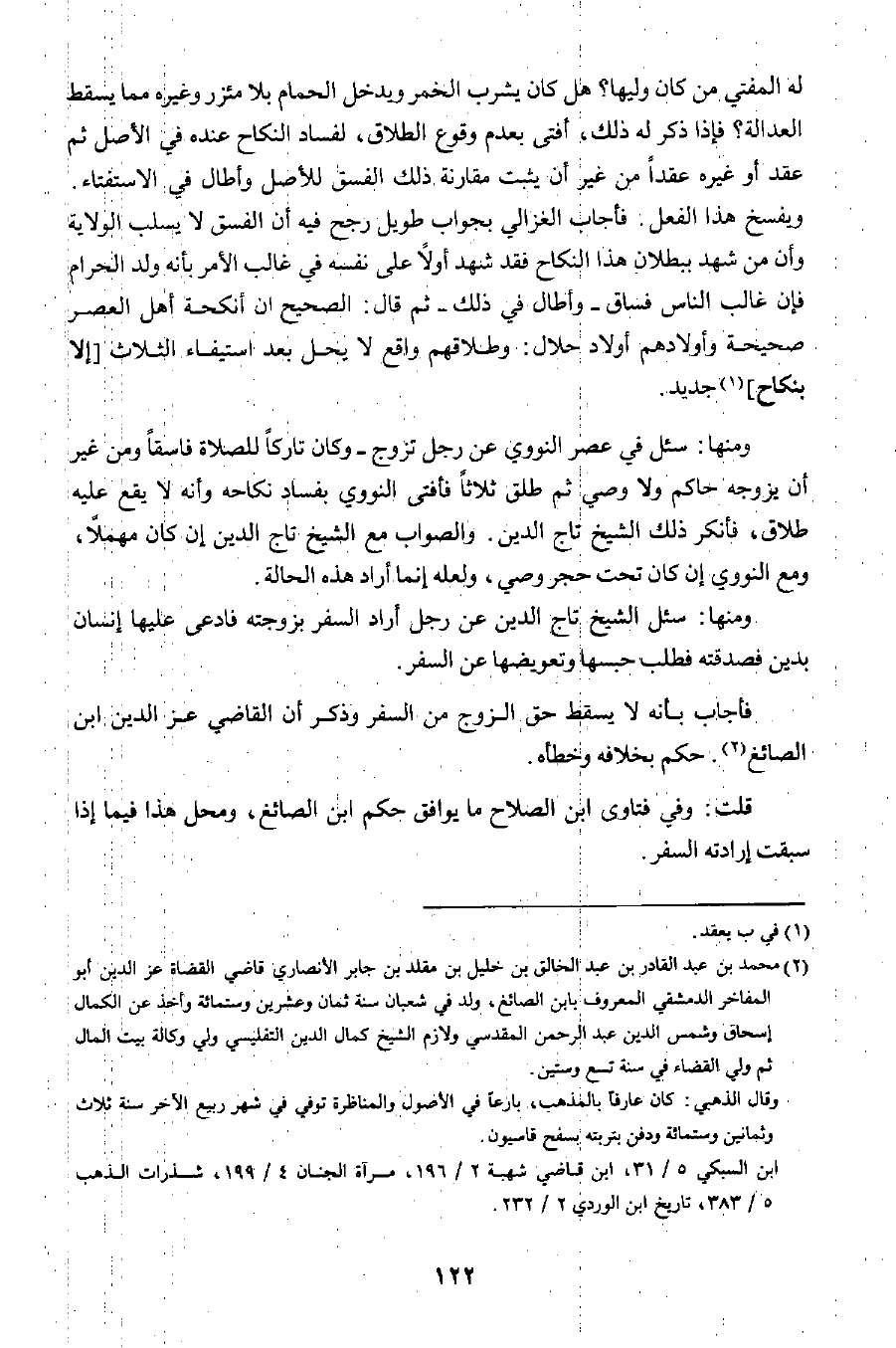 ومنها: سئل في عصر النووي عن رجل تزوج -وكان تاركا للصلاة فاسقا ومن غير أن يزوجه حاكم ولا وصي ثم طلق ثلاثا فأفتى النووي بفساد نكاحه، وأن لا يقع عليه طلاق؛ فأنكر ذلك الشيخ تاج الدين. والصواب مع الشيخ تاج الدين إن كان مهملا، ومع النووي إن كان تحت جدر وصي، ولعله إنما أراد هذه الحالة.