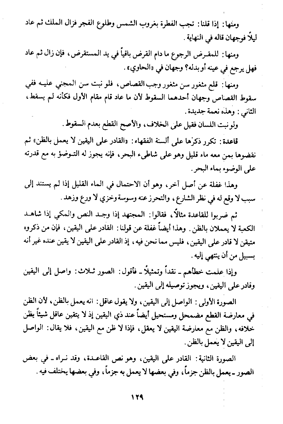 الصورة الثانية: القادر على اليقين، وهو نص القاعدة، وقد نراه -في بعض الصور- يعمل بالظن جزما، وفي بعضها لا يعمل به جزما، وفي بعضها يختلف فيه.