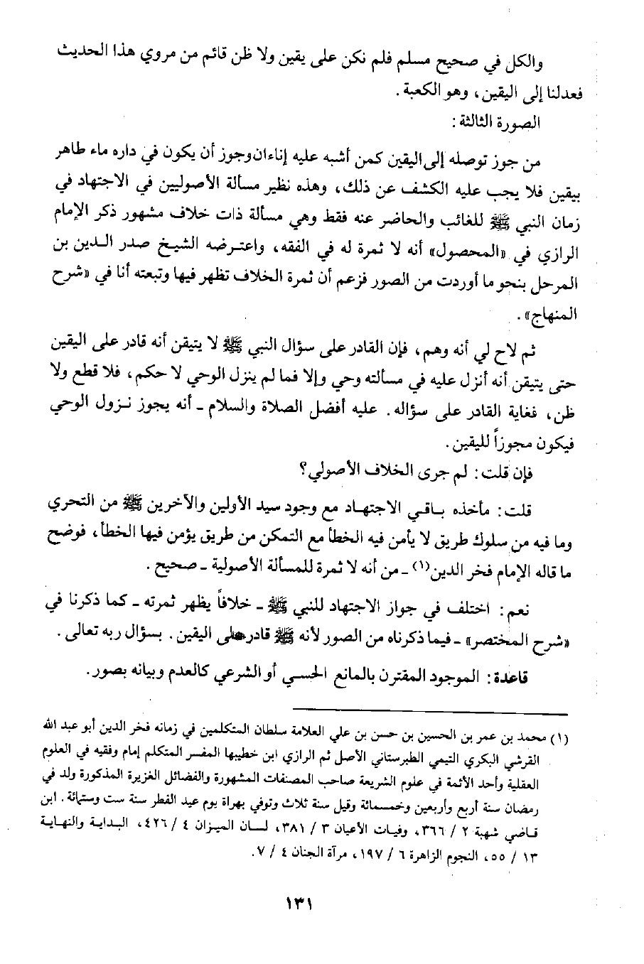 ثم لاح لي أنه وهم، فإن القادر على سؤال النبي صلى الله عليه وسلم لا يتقين أنه قادر على اليقين حتى يتيقن أنه أنزل عليه في مسألته وحي؛ وإلا فما لم ينزل الوحي لا حكم، فلا قطع ولا ظن؛ فغاية القادر على سؤاله. عليه أفضل الصلاة والسلام- وأنه يجوز نزول الوحي فيكون مجوزا لليقين.
