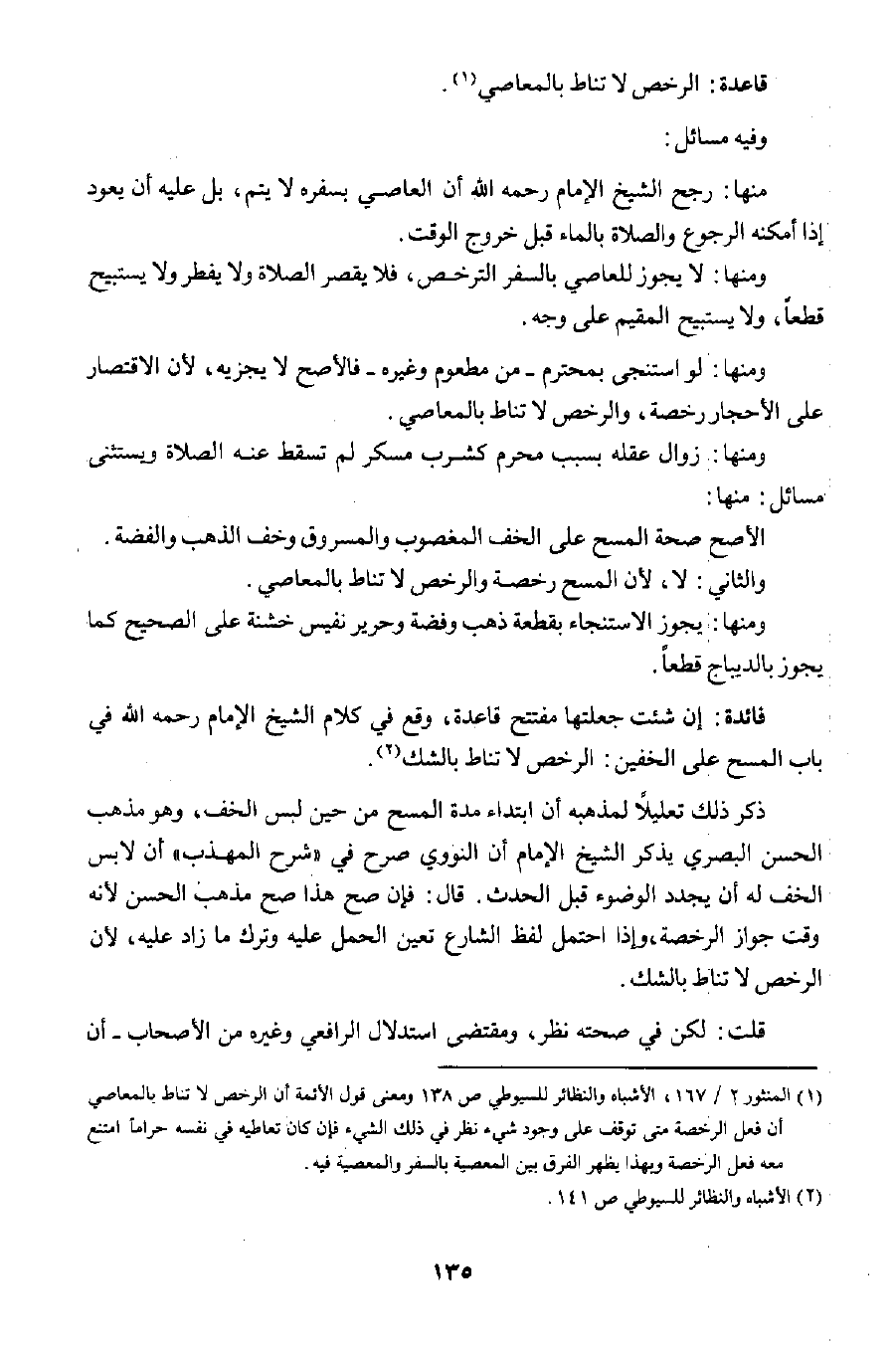 ١ المنثور ٢/ ١٦٧، الأشباه والنظائر للسيوطي ص١٣٨ ومعنى قول الأئمة أن الرخص لا تناط بالمعاصي أن فعل الرخصة متى توقف على وجود شيء نظر في ذلك الشي؛ فإن كان تعاطيه في نفسه حراما امتنع معه فعل الرخصة وبهذا يظهر الفرق بين المعصية بالسفر والمعصية فيه.