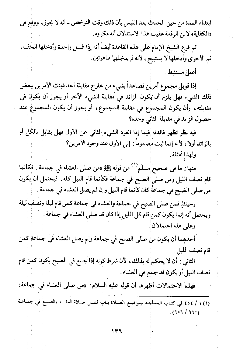 منها: ما في صحيح مسلم١ من قوله صلى الله عليه وسلم: "من صلى العشاء في جماعة؛ فكأنما قام نصف الليل ومن صلى الصبح في جماعة فكأنما قام الليل كله". فيحتمل أن يكون من صلى الصبح في جماعة كان كأنما قام الليل وإن لم يصل العشاء في جماعة.