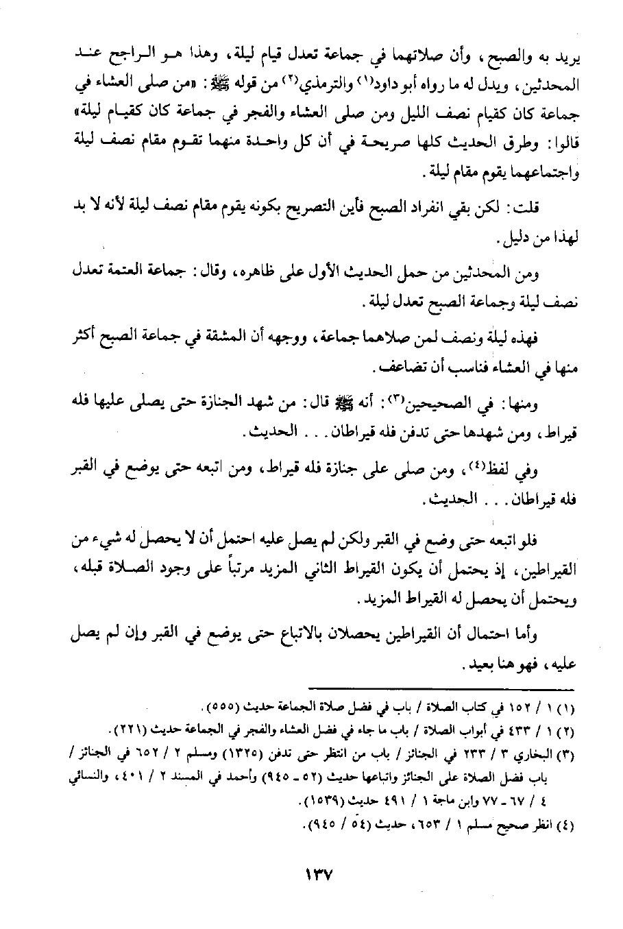 ومن المحدثين من حمل الحديث الأول على ظاهره، وقال: جماعة العتمة تعدل نصف ليلة وجماعة الصبح تعدل ليلة.