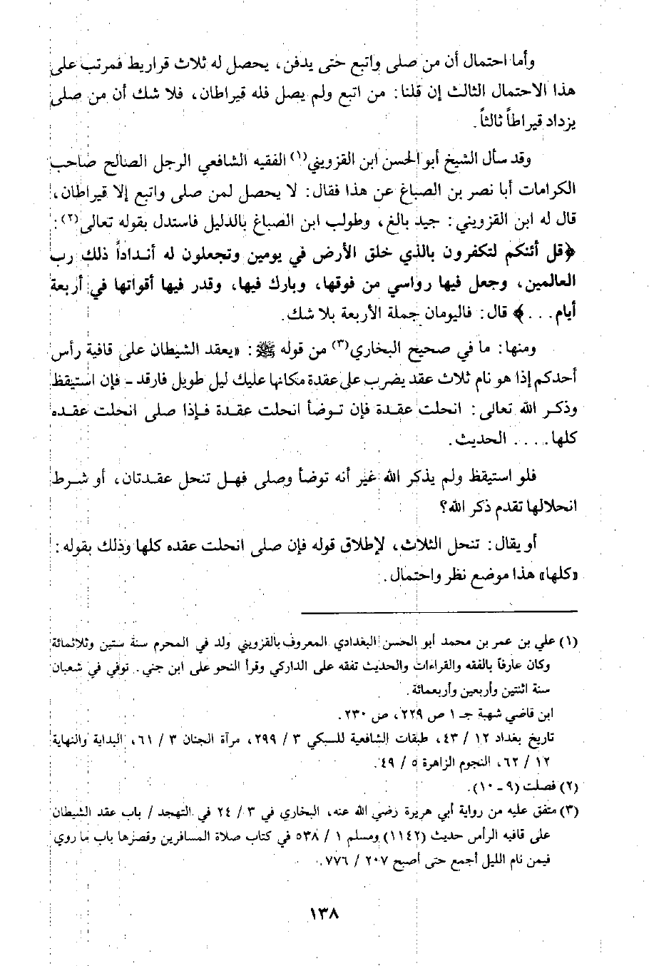 وقد سأل الشيخ أبو الحسن ابن القزويني١ الفقيه الشافعي الرجل الصالح صاحب الكرامات أبا نصر بن الصباغ عن هذا فقال: لا يحصل لمن صلى واتبع إلا قيراطان، قال له ابن القزويني: جيد بالغ، وطولب ابن الصباغ بالدليل فاستدل بقوله تعالى٢: