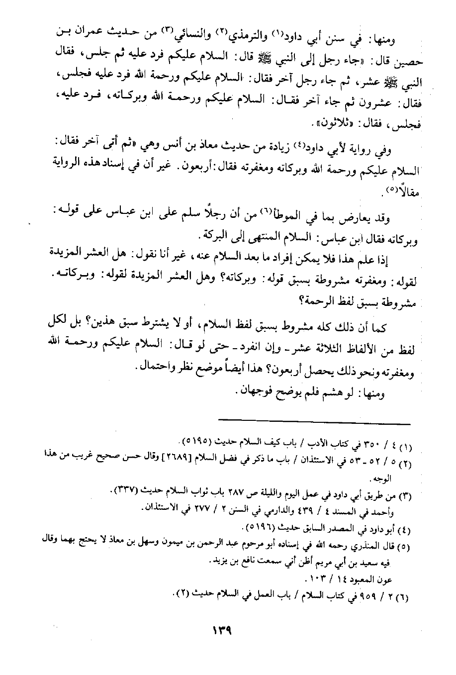 ومنها: في سنن أبي داود١ والترمذي٢ والنسائي٣ من حديث عمران بن حصين قال: "جاء رجل إلى النبي صلى الله عليه وسلم قال: السلام عليكم فرد عليه ثم جلس؛ فقال النبي صلى الله عليه وسلم عشر، ثم جاء رجل آخر فقال: السلام عليكم ورحمة الله فرد عليه فجلس؛ فقال: عشرون ثم جاء آخر فقال: السلام عليكم ورحمة الله وبركاته، فرد عليه، فجلس، فقال: "ثلاثون".