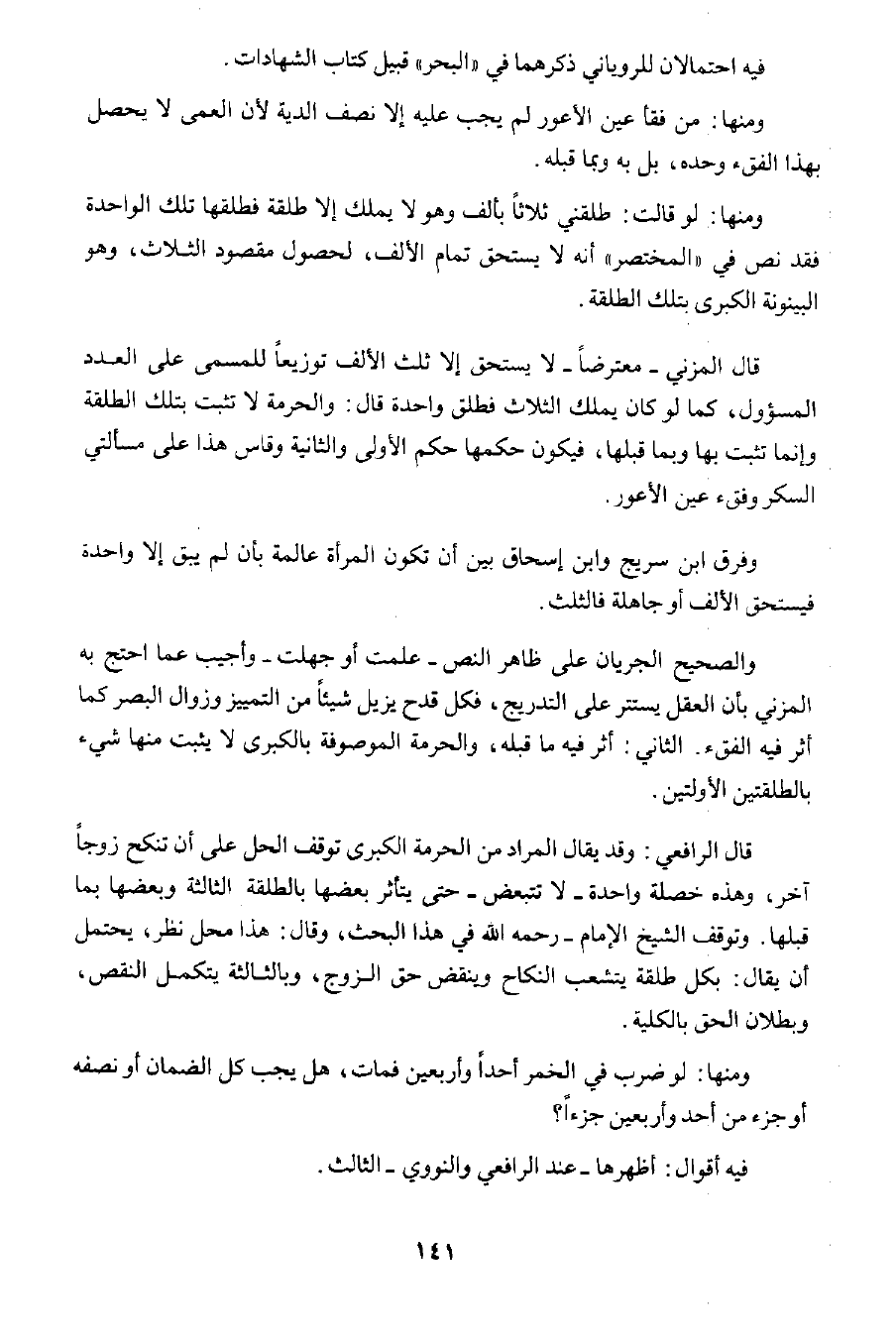 قال الرافعي: وقد يقال المراد م الحرمة الكبرى توقف الحل على أن تكح زوجا آخر، وهذه خصلة واحدة -لا تتبعض- حتى يتأثر بعضها بالطلقة الثالثة وبعضها بما قبلها. وتوقف الشيخ الإمام -رحمه الله في هذا البحث، وقال: هذا محل نظر، يحتمل أن يقال: بكل طلقة يتشعب النكاح وينقض حق الزوجة، وبالثالثة يتكمل النقص، وبطلان الحق بالكلية.