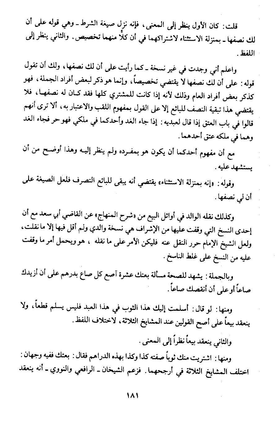 واعلم أني وجدت في غير نسخة -كما رأيت على أن لك نصفها، ولك أن تقول قوله: على أن لك نصفها لا يقتضي تخصيصا؛ وإنما هو ذكر لبعض أفراد الجملة، فهو كذكر بعض أفراد العام وذلك لأنه إذا كانت للمشتري كلها فقد كان له نصفها، فلا يقتضي هذا تبقية النصف للبائع إلا على القول بمفهوم اللقب والاعتبار به؛ ألا ترى أنهم قالوا في باب العتق إذا قال لعبديه: إذا جاء الغد وأحدكما في ملكي فهو حر فجاء الغد وهما في ملكه عتق أحدهما.