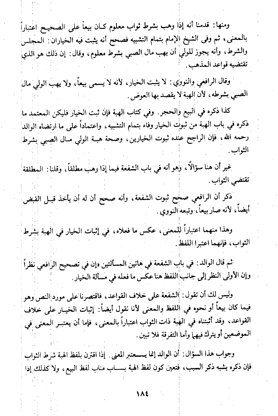 ومنها: قدمنا أنه إذا وهب بشرط ثواب معلوم كان بيعا على الصحيح اعتبارا بالمعنى، ثم وفي الشيخ الإمام بتمام التشبيه فصحح أنه يثبت فيه الخياران: المجلس والشرط، وأنه يجوز للولي أن يهب مال الصبي بشرط معلوم، وقال: إن ذلك هو الذي تقتضيه قواعد المذهب.