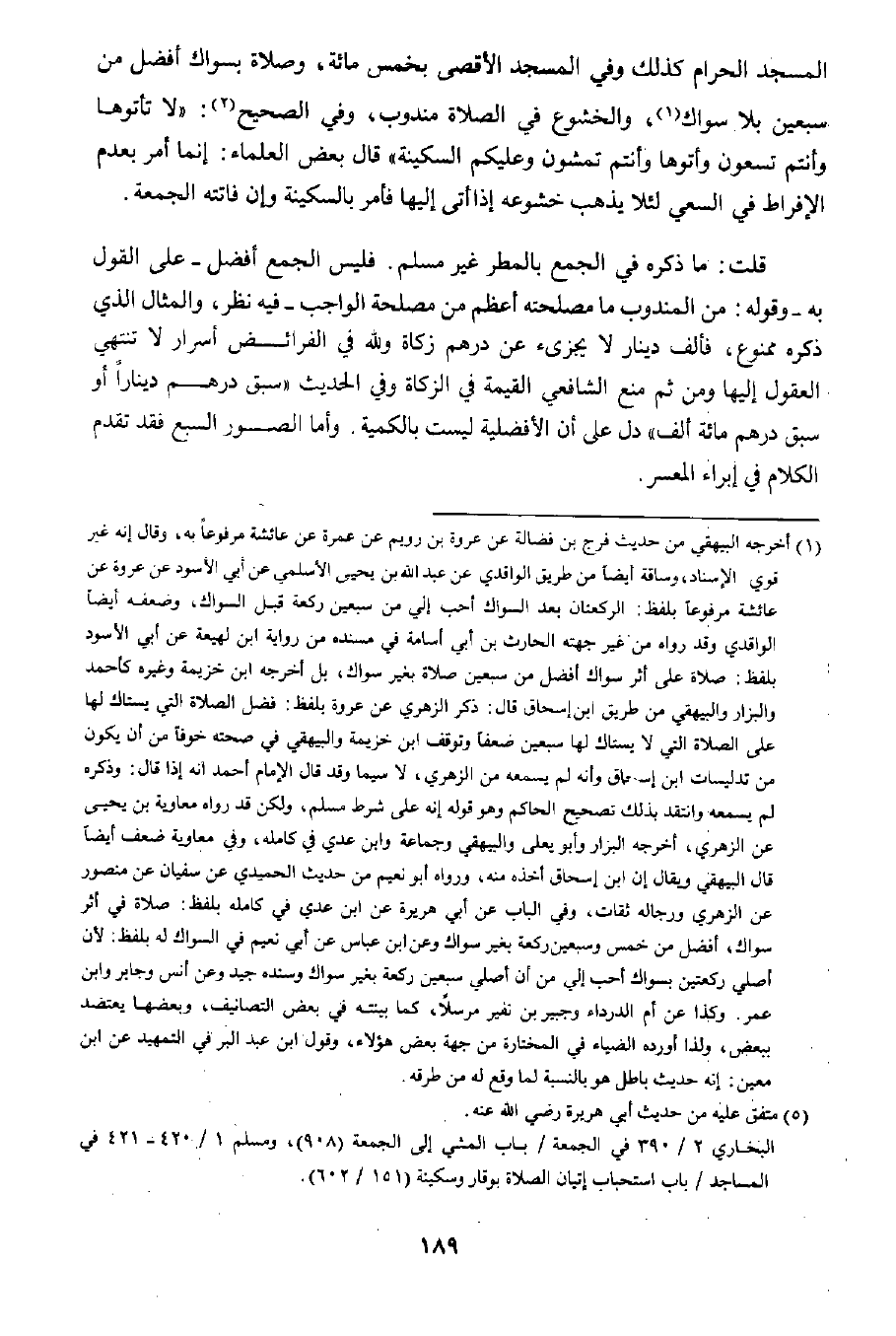 المسجد الحرام كذلك وفي المسجد الأقصى بخمس مائة، وصلاة بسواك أفضل من سبعين بلا سواك١، والخشوع في الصلاة مندوب، وفي الصحيح٢: "لا تأتوها وأنتم تسعون وأتوها وأنتم تمشون وعليكم السكينة" قال بعض العلماء: إنما أمر بعدم الإفراط في السعي لئلا يذهب خشوعه إذا أتى إليها فأمر بالسكينة وإن فاتته الجمعة.