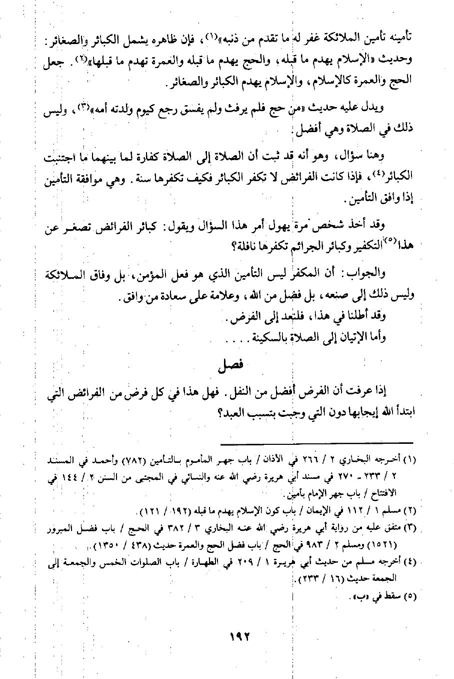 وهنا سؤال، وهو أنه قد ثبت أن الصلاة إلى الصلاة كفارة لما بينهما ما اجتنبت الكبائر٤؛ فإذا كانت الفرائض لا تكفر الكبائر فكيف تكفرها سنة. وهي موافقة التأمين إذا وافق التأمين.