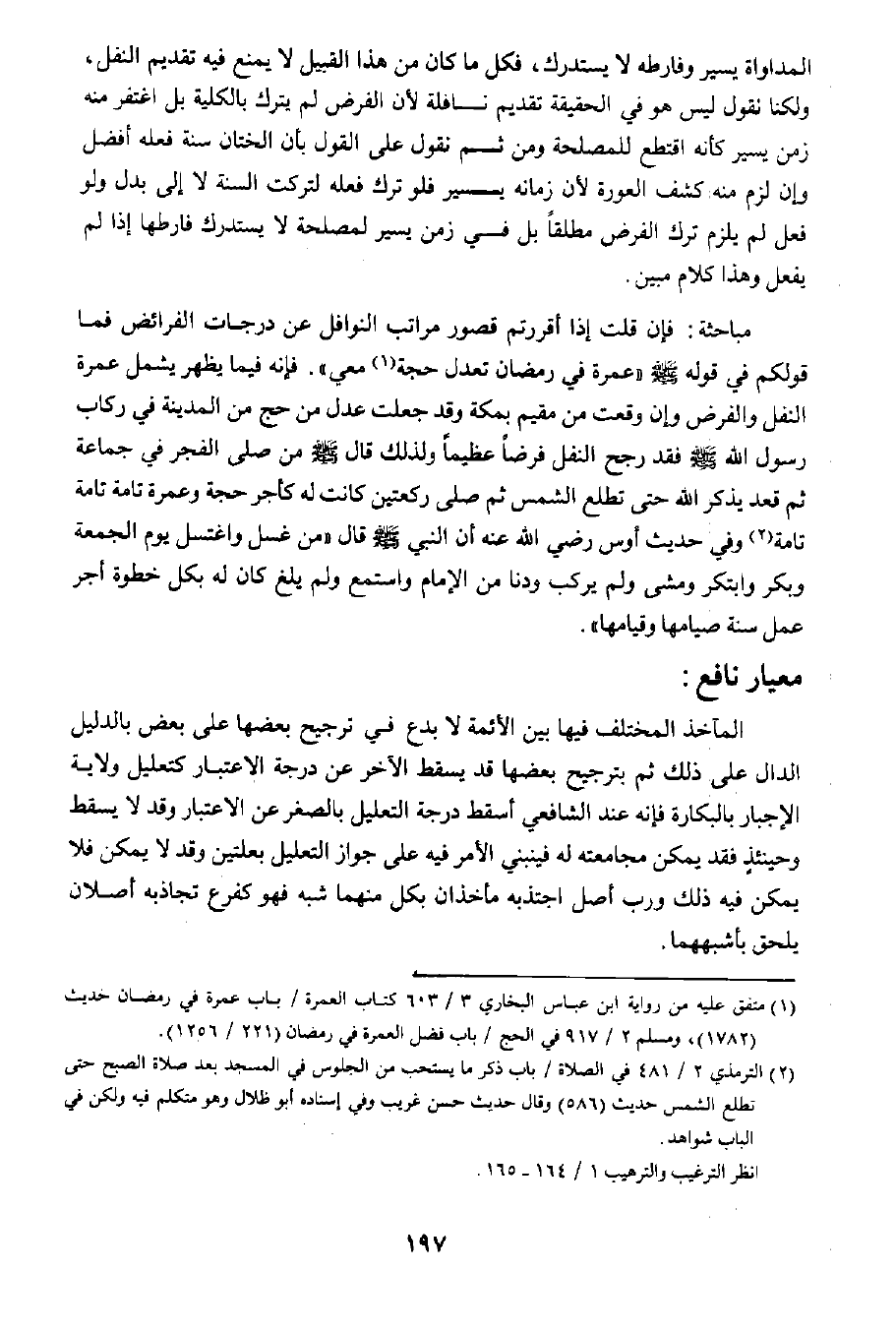 مباحثة: فإن قلت إذا أقررتم قصور مراتب النوافل عن درجات الفرائض فما قولكم في قوله صلى الله عليه وسلم "عمرة في رمضان تعدل حجة ١ معي"؛ فإنه فيما يظهر يشمل عمرة النفل والفرض وإن وقعت من مقيم بمكة وقد جعلت عدل من حج من المدينة في ركاب رسول الله صلى الله عليه وسلم فقد رجع النفل فرضا عظيما، ولذلك قال صلى الله عليه وسلم: "من صلى الفجر في جماعة ثم قعد يذكر الله حتى تطلع الشمس ثم صلى ركعتين كانت له كأجر حجة وعمرة تامة تامة تامة" ٢، وفي حديث أوس رضي الله عنه أن النبي صلى الله عليه وسلم قال "من غسل واغتسل يوم الجمعة وبكر ابتكر ومشى ولم يركب ودنا من الإمام واستمع ولم يلغ كان له بكل خطوة أجر عمل سنة صيامها وقيامها".