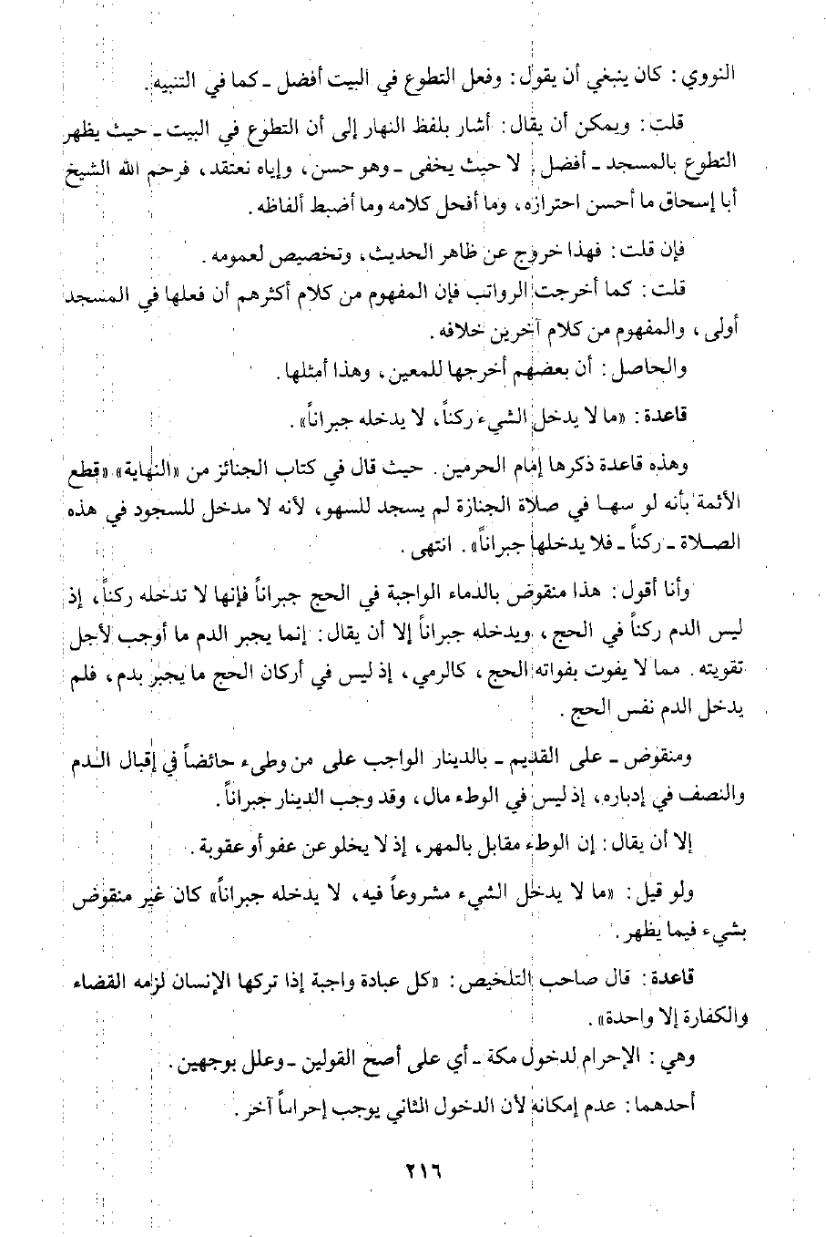 وأنا أقول: هذا منقوض بالدماء الواجبة في الحج جبرانا؛ فإنها لا تدخله ركنا؛ إذ ليس الدم ركنا في الحج، ويدخله جبرانا إلا أن يقال: إنما يجبر الدم ما أوجب لأجل تقويته. مما لا يفوت بفواته الحج، كالرمي؛ إذ ليس في أركان الحج ما يجبر بدم، فلم يدخل الدم نفس الحج.