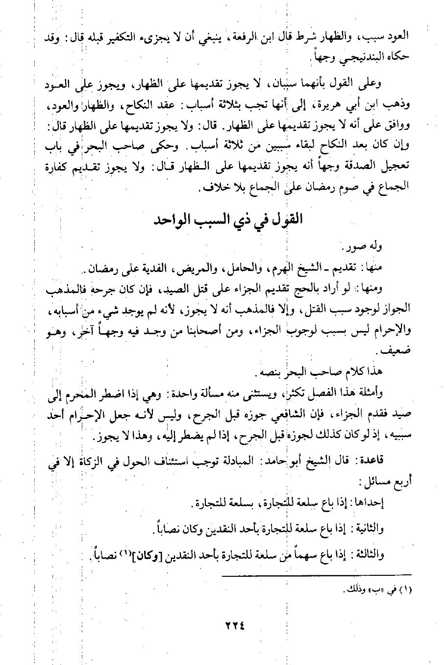 وأمثلة هذا الفصل تكثر، ويستثنى منه مسألة واحدة: وهي إذا اضطر المحرم إلى صيد فقد الجزاء؛ فإن الشافعي جوزه قبل الجرح، ليس لأنه جعل الإحرام أحد سببيه؛ إذ لو كان كذلك قبل الجرح، إذا لم يضطر إليه، وهذا لا يجوز.