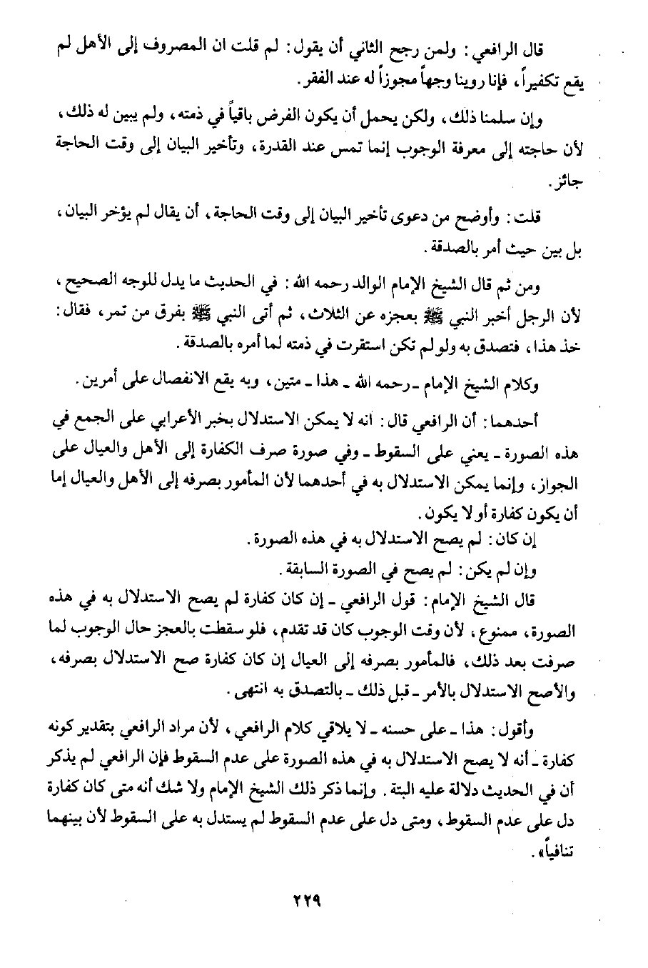 أحدهما: أن الرافعي قال: إنه لا يمكن الاستدلال بخبر الأعرابي على الجمع في هذه الصورة -يعني على السقوط- وفي صورة صرف الكفارة إلى الأهل والعيال على الجواز؛ وإنما يمكن الاستدلال به في أحدهما لأن المأمور بصرفه إلى الأهل والعيال إما أن يكون كفارة أو لا يكون.