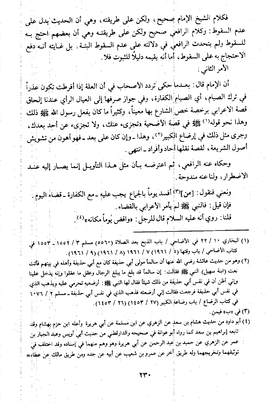 فكلام الشيخ الإمام صحيح؛ ولكن على طريقته، وهي أن الحديث أن الحديث يدل على عدم السقوط: وكلام الرافعي صحيح ولكن على طريقته، وهي أن بعضهم احتج به للسقوط ولم يتحدث الرافعي في دلالته على عدم السقوط البتة؛ بل غايته أنه دفع الاحتجاج به على السقوط، أما أنه بقيمه دليلا للثبوت فلا.
