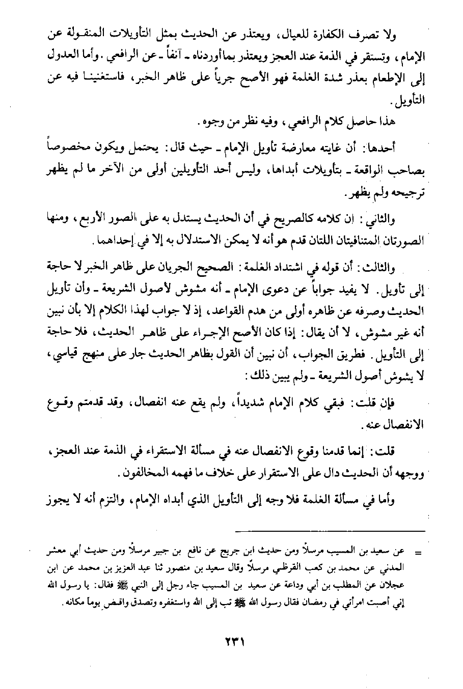 والثالث: أن قوله في اشتداد الغلمة: الصحيح الجريان على ظاهر الخبر لا حاجة إلى تأويل. لا يفيد جوابا عن دعوى الإمام -أنه مشوش لأصول الشريعة، وأن تأويل الحديث وصرفه عن ظاهره أولى من هدم القواعد؛ إذ لا جواب لهذا الكلام إلا بأن نبين أنه غير مشوش، لا أن يقال: إذا كان الأصح الإجراء على ظاهر الحديث؛ فلا حاجة إلى التأويل؛ فطريق الجواب، أن نبين أن القول بظاهر الحديث جار على منهج قياسي، لا يشوش أصول الشريعة- ولم يبين ذلك: