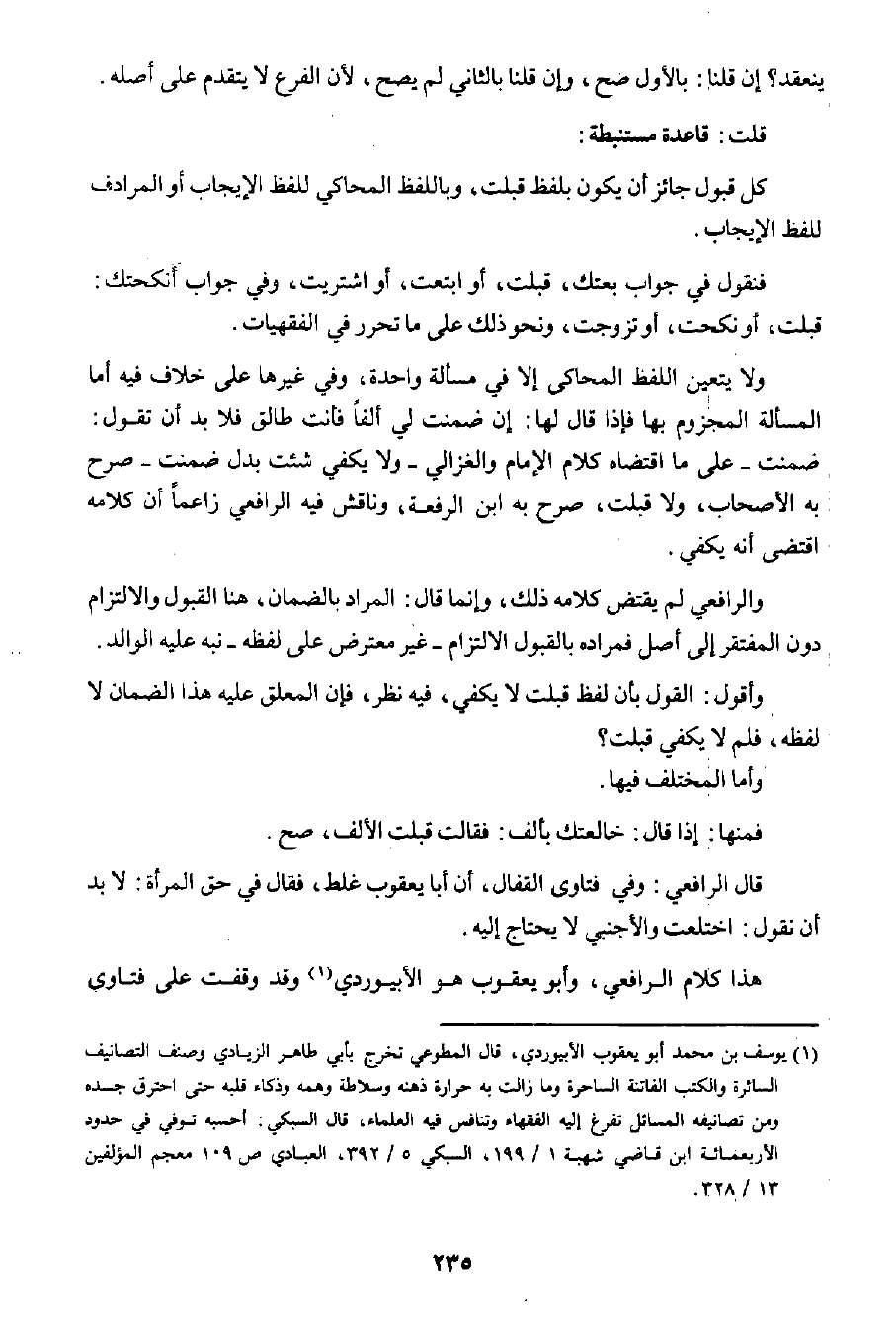 هذا كلام الرافعي، وأبو يعقوب هو الأبيوردي١ وقد وقفت على فتاوى