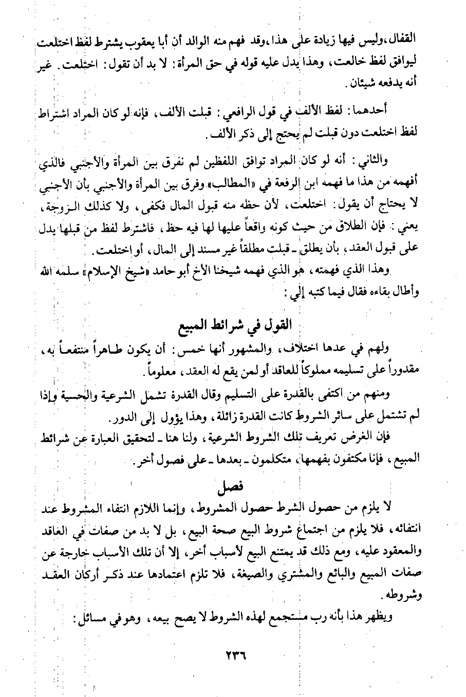 فإن الغرض تعريف تلك الشروط الشرعية، ولنا هنا لتحقيق العبارة عن شرائط المبيع؛ فإنا مكتفون بفهمها، متكلمون -بعدها- على فصول أخر.
