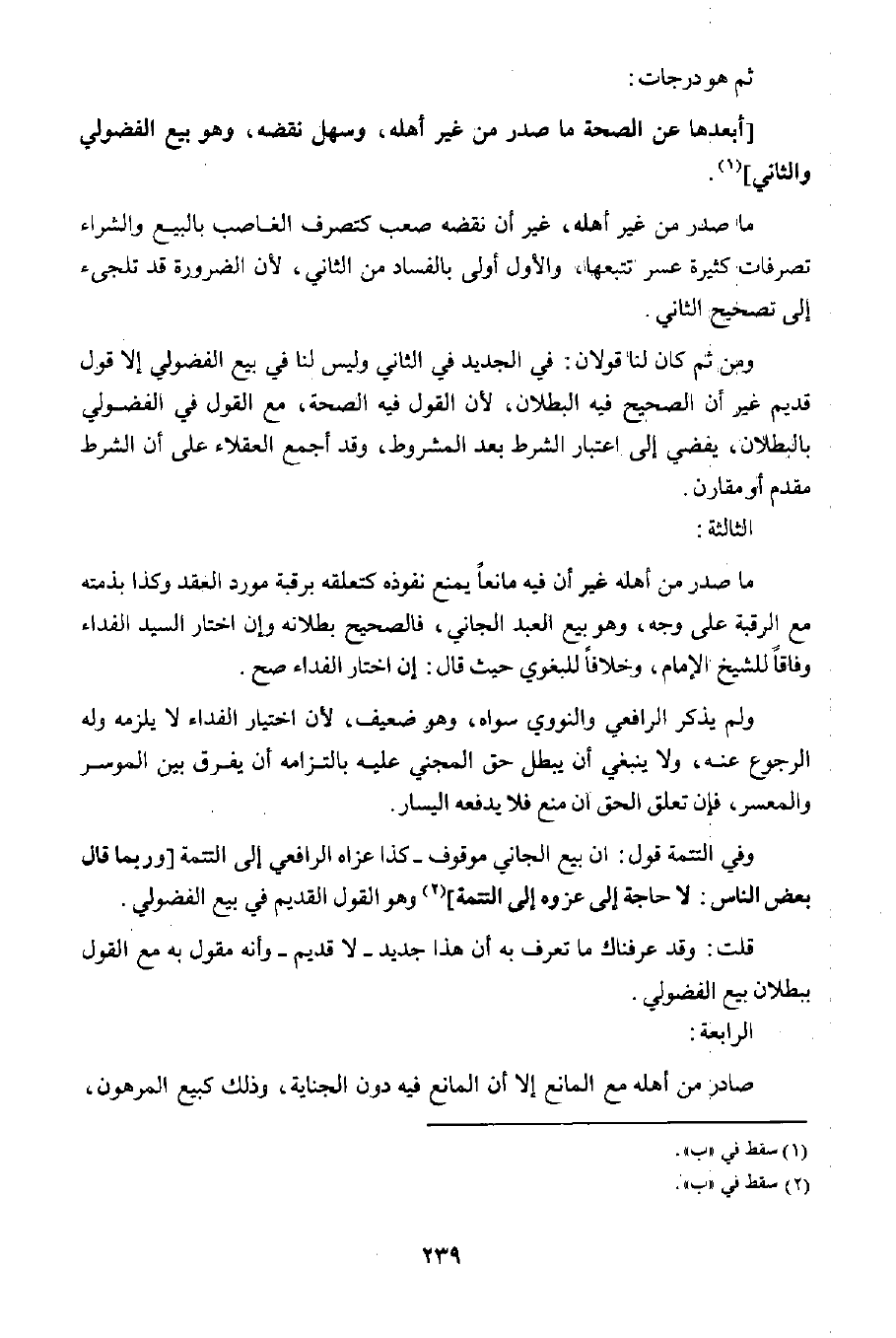 ومن ثم كان لنا قولان: في الجديد في الثاني وليس لنا في بيع الفضولي؛ إلا قول قديم؛ غير أن الصحيح في البطلان؛ لأن القول فيه الصحة، مع القول في الفضولي بالبطلان، يفضي إلى اعتبار الشرط بعد المشروط، وقد أجمع العقلاء على أن الشرط مقدم أو مقارن.