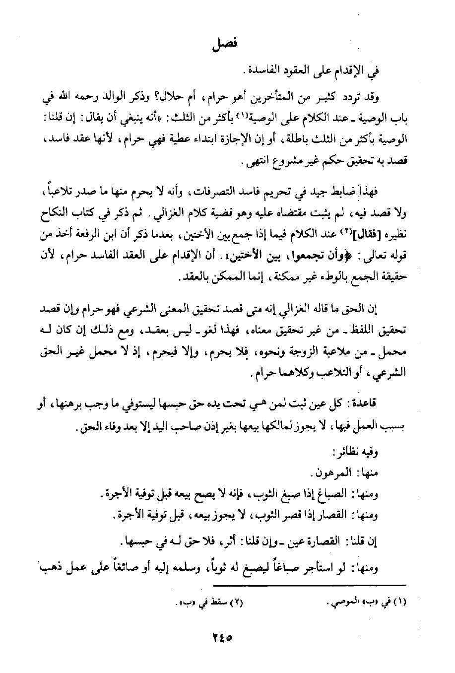 فهذا ضابط جيد في تحريم فاسد التصرفات، وأنه لا يحرم منها ما صدر تلاعبا، ولا قصد فيه، لم يثبت مقتضاه عليه وهو قضية كلام الغزالي. ثم ذكر في كتاب النكاح نظيره [فقال] ٢ عند الكلام فيما إذا جمع بين الأختين، بعدما ذكر أن ابن الرفعة أخذ من قوله تعالى: {وَأَنْ تَجْمَعُوا بَيْنَ الْأُخْتَيْنِ} . أن الإقدام على العقد الفاسد حرام؛ لأن حقيقة الجمع بالوطء غير ممكنة؛ إنما الممكن بالعقد.