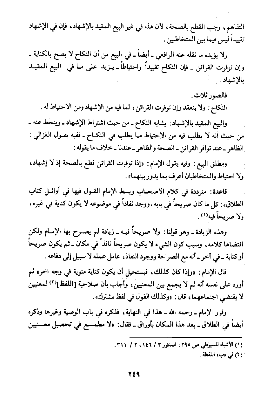 والبيع المقيد بالإشهاد: يشابه النكاح -من حيث اشتراط الإشهاد- وينحط عنه من حيث أنه لا يطلب فيه من الاحتياط ما يطلب في النكاح؛ ففيه يقول الغزالي: الظاهر -عند توافر القرائن- الصحة والظاهر- عندنا- خلاف ما يقوله: