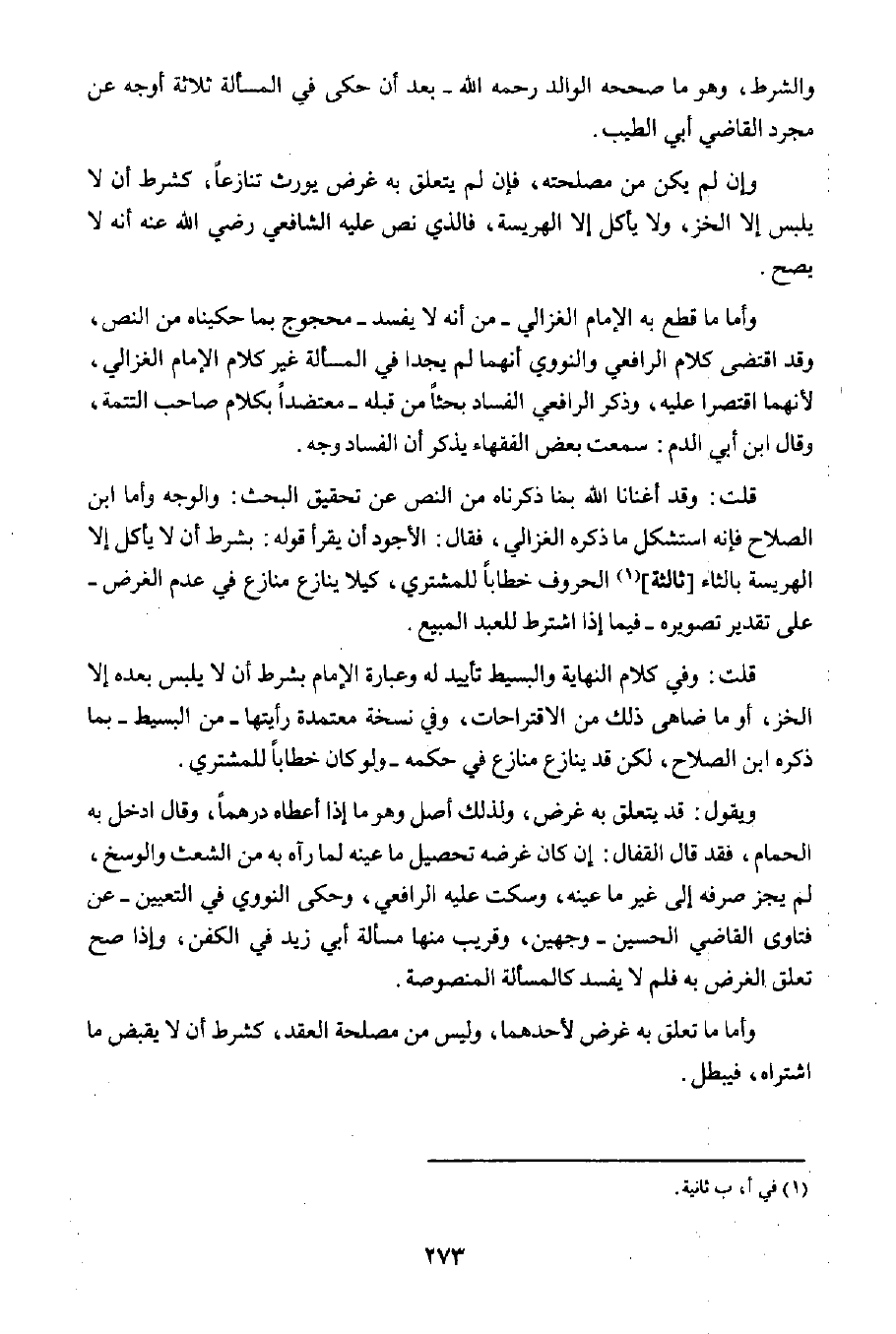 قلت: وقد أغنانا الله بما ذكرناه من النص عن تحقيق البحث: والوجه وأما ابن الصلاح؛ فإنه استشكل ما ذكره الغزالي؛ فقال: الأجود أن يقرأ قوله: بشرط أن لا يأكل إلا الهريسة بالثاء [ثالثة] ١ الحروف خطابا للمشتري، كيلا ينازع منازع في عدم الغرض -على تقدير تصويره- فيما إذا اشترط للعبد المبيع.