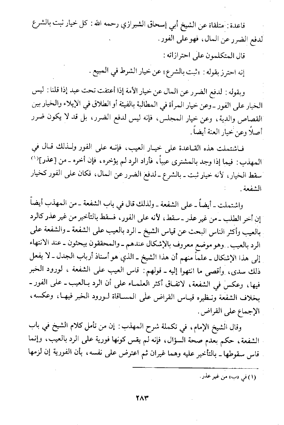 واشتملت -أيضا- على الشفعة- ولذلك قال في باب الشفعة- من المهذب أيضا إن أخر الطلب -من غير عذر- سقط؛ لأنه على الفور، فسقط بالتأخير من غير عذر كالرد بالعيب. وهو موضع معروف بالإشكال عندهم -والمحققون يبحثون- عند الانتهاء إلى هذا الإشكال- علما منهم أن هذا الشيخ - الذي هو أستاذ أرباب الجدل- لا يفعل ذلك سدى، وأقصى ما انتهوا إليه - قولهم: قاس العيب على الشفعة، لورود الخبر فيها، وعكس في الشفعة؛ لاتفاق أكثر العلماء على أن الرد بالعيب -على الفور- بخلاف الشفعة ونظيره قياس القراض على المساقاة لورود الخبر فيها، وعكسه الإجماع على القراض.