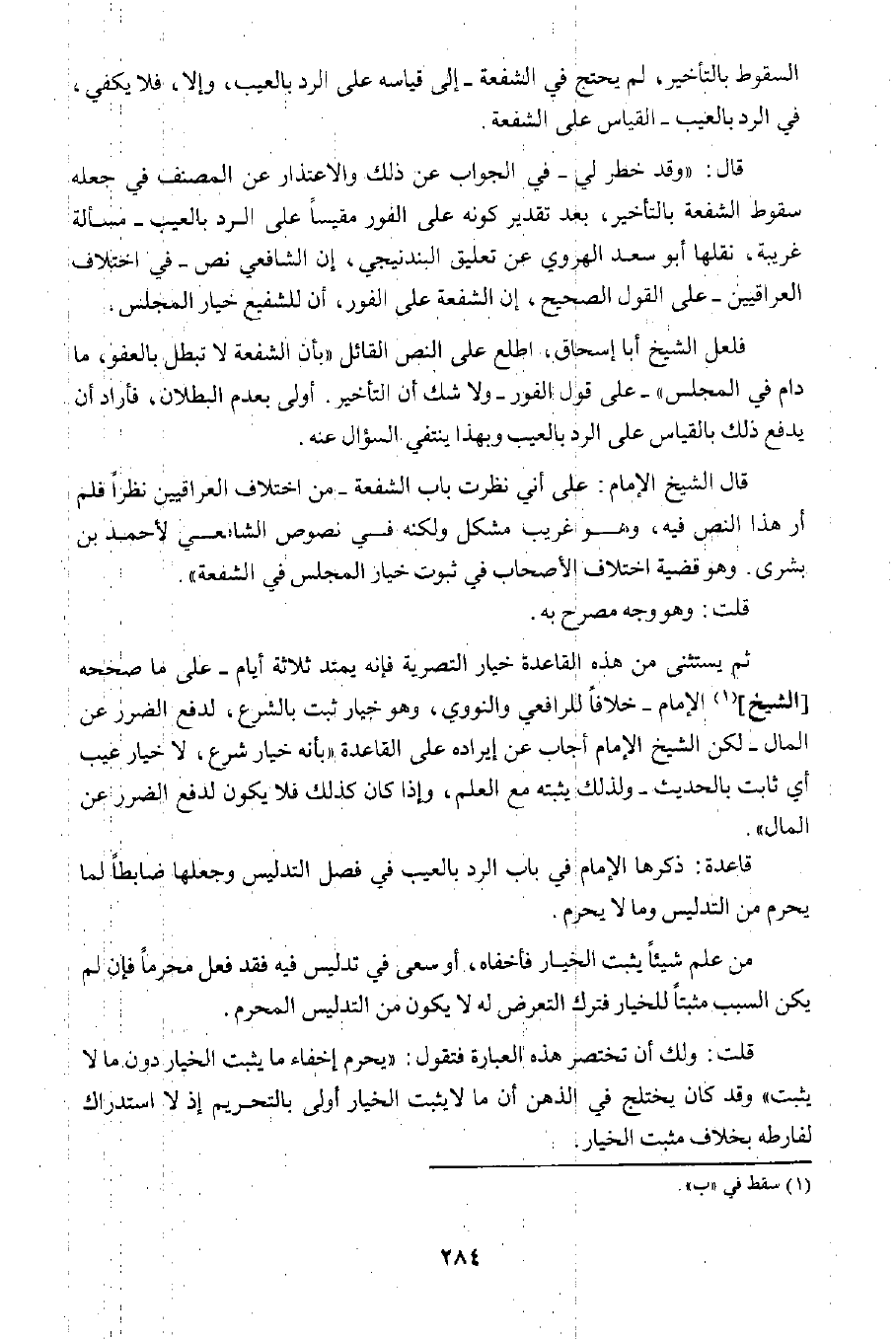 قال الشيخ الإمام: على أني نظرت باب الشفعة -من اختلاف العراقيين نظرا؛ فلم أر هذا النص فيه، وهو غريب مشكل ولكنه في نصوص الشافعي لأحمد بن بشرى. وهو قضية اختلاف الأصحاب في ثبوت خيار المجلس في الشفعة".
