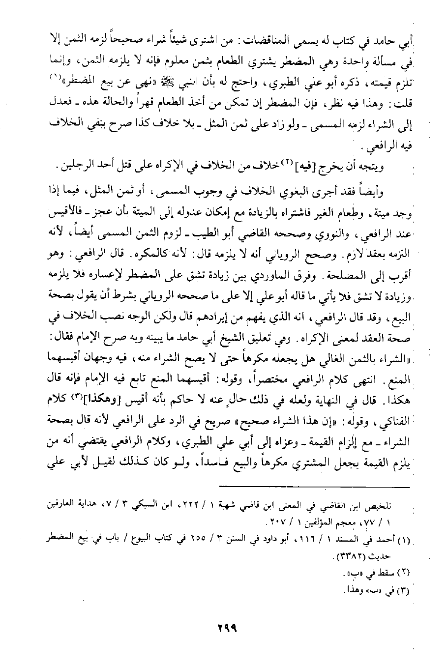 أبي حامد في كتاب له يسمى المناقضات: من اشترى شيئا شراء صحيحا لزمه الثمن؛ إلا في مسألة واحدة وهي المضطر يشتري الطعام بثمن معلوم فإنه لا يلزم الثمن؛ وإنما تلزم قيمته، ذكره أبو علي الطبري، واحتج له بأن النبي صلى الله عليه وسلم "نهى عن بيع المضطر"١ قلت: وهذا فيه نظر، فإن المضطر إن تمكن من أخذ الطعام قهرا والحالة هذه -فعدل إلى الشراء لزمه المسمى- ولو زاد على ثمن المثل بلا خلاف كذا صرح بنفي الخلاف فيه الرافعي.