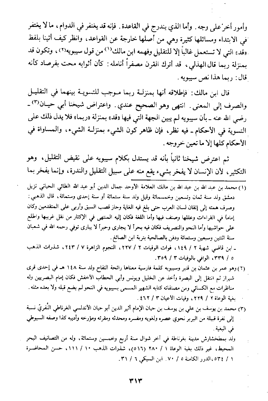 ٢ وهو عمر بن عثمان بن قنبر وسيبويه كلمة فارسية معناها رائحة التفاح ولد سنة ١٤٨هـ في إحدى قرى شيراز، ثم انتقل إلى البصرة وأخذ عن الخليل ويونس وأبي الحطاب الأخفش؛ فكان إمام البصريين وله مناظرات مع الكسائي ومن مصنفاته كتابه الشهير المسمى بسيبويه في النحو لم يضع قبله ولا بعد مثله. بغية الوعاة ٢/ ٢٢٩، وفيات الأعيان ٣/ ٤٦٢.