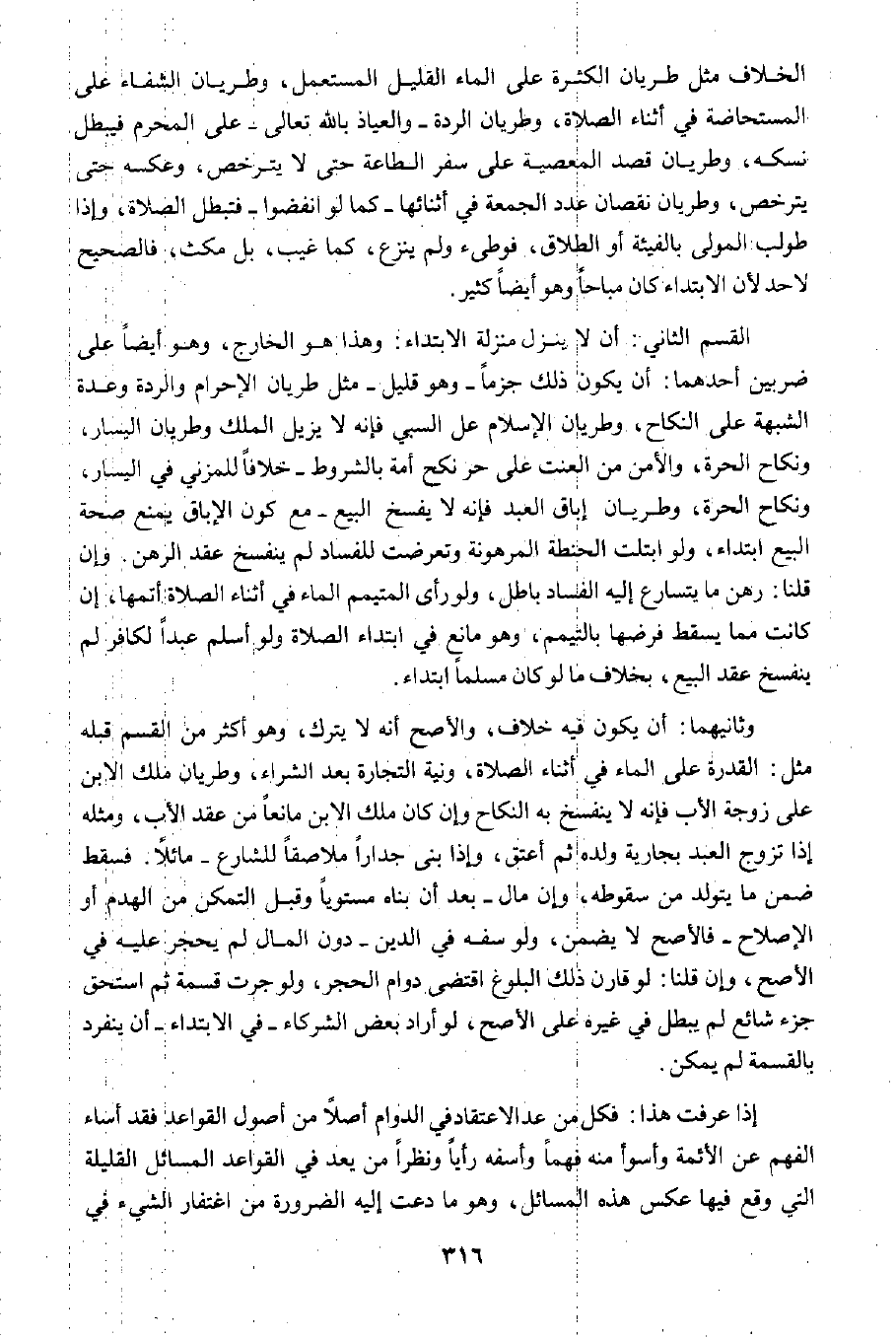 وثانيهما: أن يكون فيه خلاف، والأصح أنه لا يترك، وهو أكثر من القسم قبله مثل: القدرة على الماء في أثناء الصلاة، ونية التجارة بعد الشراء، وطريان ملك الابن على زوجة الأب؛ فإنه لا يفسخ به النكاح وإن كان ملك الابن مانعا من عقد الأب، ومثله إذا تزوج العبد بجارية ولده ثم أعتق، وإذا بنى جدارًا ملاصقًا للشارع -مائلًا؛ فسقط ضمن ما يتولد من سقوطه، وإن مال -بعد أن بناه مستويًا وقبل التمكن من الهدم أو الإصلاح- فالأصح لا يضمن، ولو سفه في الدين -دون المال لم يحجر عليه في الأصح، وإن قلنا: لو قارن ذلك البلوغ اقتضى دوام الحجر، ولو جرت قسمة ثم استحق جزء شائع لم يبطل في غيره على الأصح، لو أراد بعض الشركاء -في الابتداء- أن ينفرد بالقسمة لم يمكن.