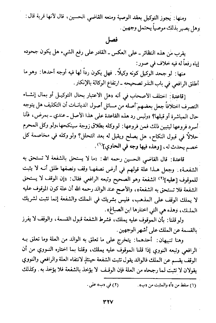 قاعدة: قال القاضي الحسين رحمه الله: "ما لا يستحق بالشفعة لا يستحق به الشفعة"، وجعل هذا علة قولهم في أرض نصفها وقف ونصفها طلق أنه لا يثبت للموقوف [عليه] ٢ الشفعة وهو الصحيح وتبعه الرافعي فقال: "إن الوقف لا يستحق الشفعة فلا تستحق به الشفعة"، والأصح عند الوالد رحمه الله أن علة كون الموقوف عليه لا يملك الوقف على المذهب؛ فليس بشريك في الملك والشفعة إنما تثبت لشريك الملك، وهذه هي التي اختارها ابن الصباغ".