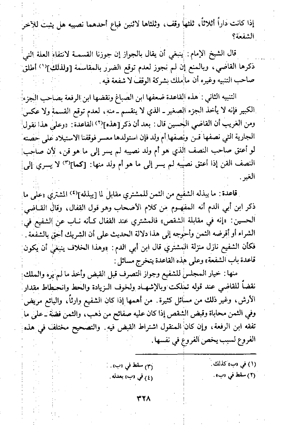 منها: خيار المجلس للشفيع وجواز التصرف قبل القبض وأخذ ما لم يره والملك نقضًا للقاضي عند قوله تملكت وبالإشهاد ولخوف الزيادة والحط وانحطاط مقدار الأرش، وغير ذلك من مسائل كثيرة. من أهمها إذا كان الشفيع وارثا، والبائع مريض وفي الثمن محاباة وقبض الشقص إذا كان عليه صفائح من ذهب، والثمن فضة -على ما تفقه ابن الرفعة، وإن كان المنقول اشتراط القبض فيه. والتصحيح مختلف في هذه الفروع لسبب يخص الفروع في نفسها.