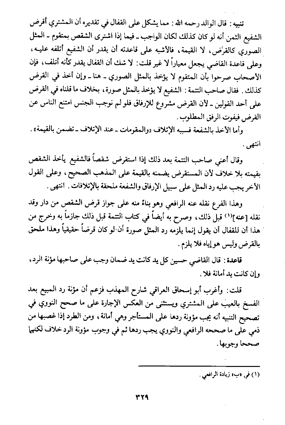 وهذا الفرع نقله عنه الرافعي وهو بناء منه على جواز قرض الشقص من دار وقد نقله [عنه] ١ قبل ذلك، وصرح به أيضا في كتاب التتمة قبل ذلك جازما به وخرج من هذا أن للقفال أن يقول إنما يلزمه رد المثل صورة أن لو كان قرضا حقيقيا وهذا ملحق بالقرض وليس هو إياه فلا يلزم.