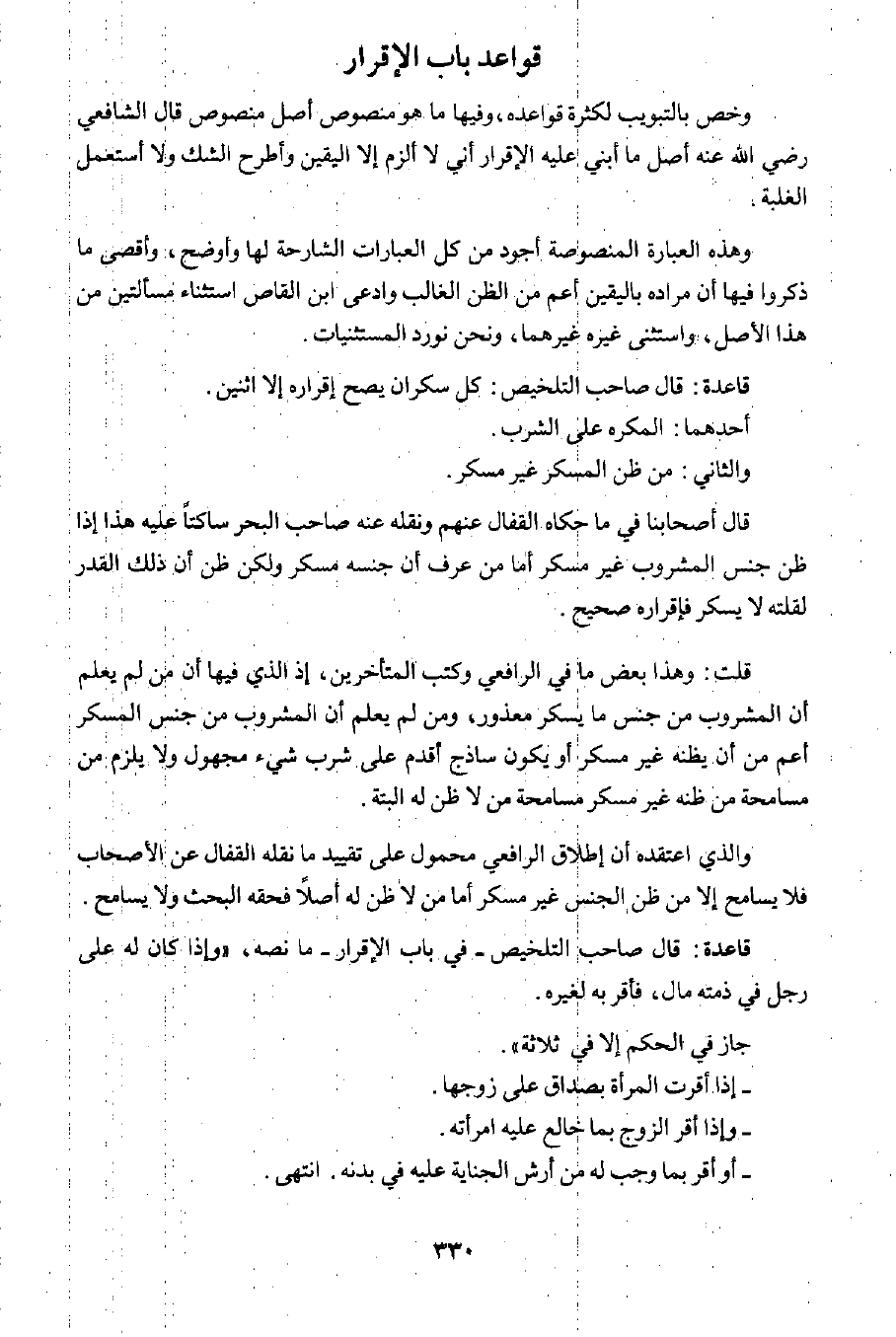 وخص بالتبويب لكثرة قواعده، وفيها ما هو منصوص أصل منصوص؛ قال الشافعي رضي الله عنه: أصل ما أبني عليه الإقرار أني لا ألزم إلا اليقين وأطرح الشك ولا أستعمل الغلبة.