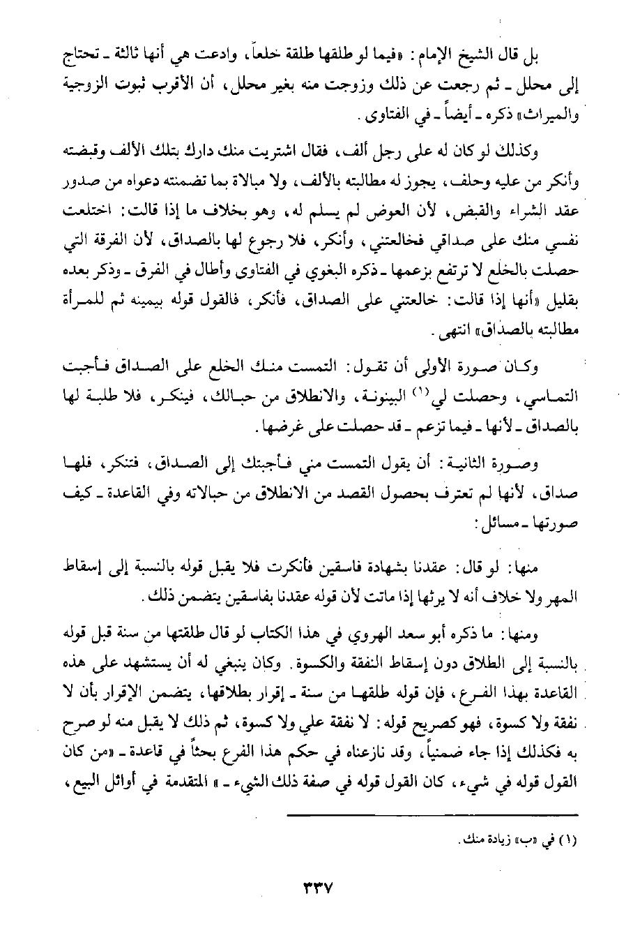 بل قال الشيخ الإمام: "فيما لو طلقها طلقة خلعا، وادعت هي أنها ثالثة -تحتاج إلى محلل- ثم رجعت عن ذلك وزوجت منه بغير محلل، أن الأقرب ثبوت الزوجية والميراث" ذكره -أيضا- في الفتاوي.